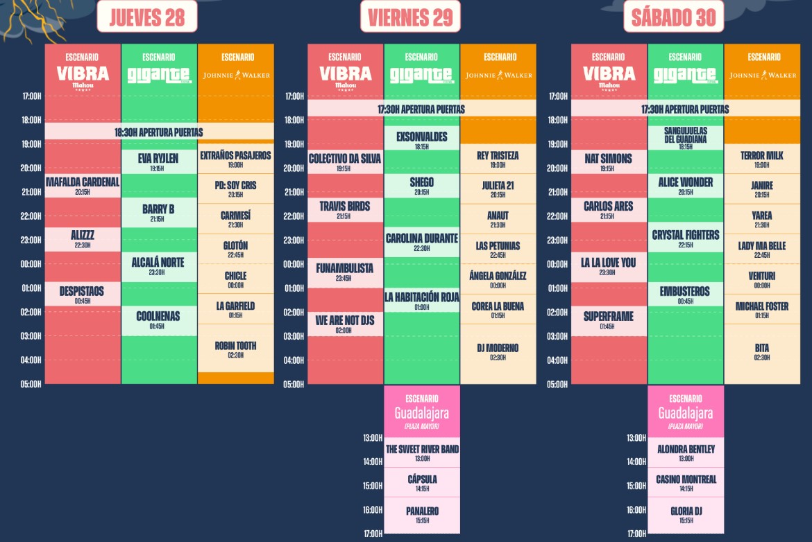 El Festival Gigante 2025, que se celebrará del 28 al 30 de agosto en la Explanada Municipal del Paseo del Ocio de Guadalajara, ya ha hecho públicos los horarios de apertura y de inicio de conciertos. La organización ha informado de que el jueves 28 las puertas se abrirán a las 18.30 horas, con comienzo de las actuaciones a las 19.00.