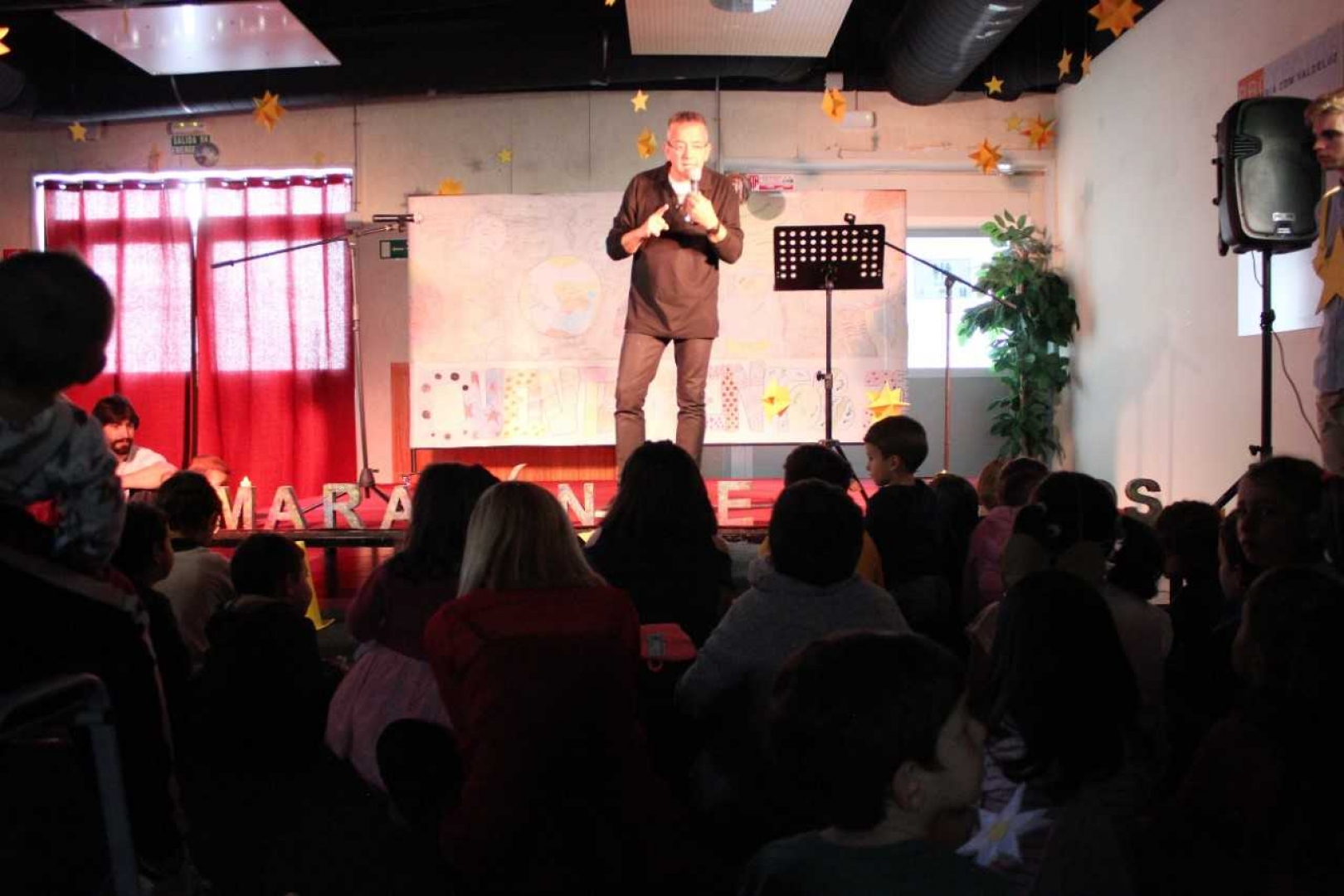 La biblioteca municipal se ambientó para la ocasión con un cielo de estrellas titilantes y un mural de telón de fondo confeccionado por los internos de la URR Alcohete, que dieron color y calor a una treintena de historias.