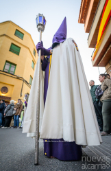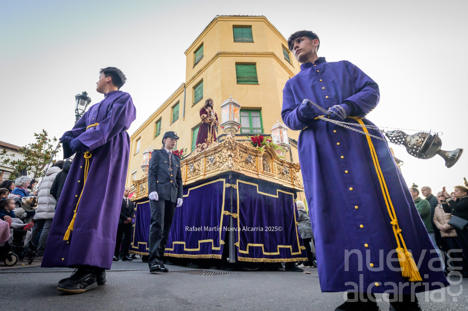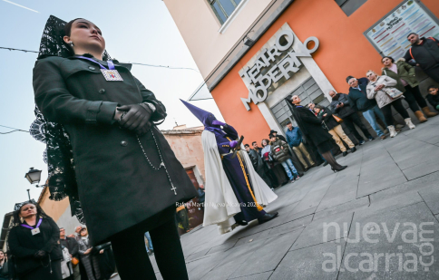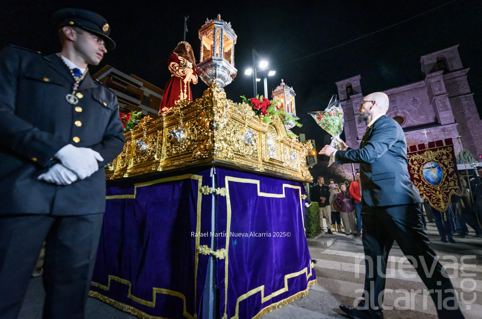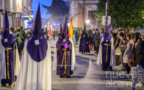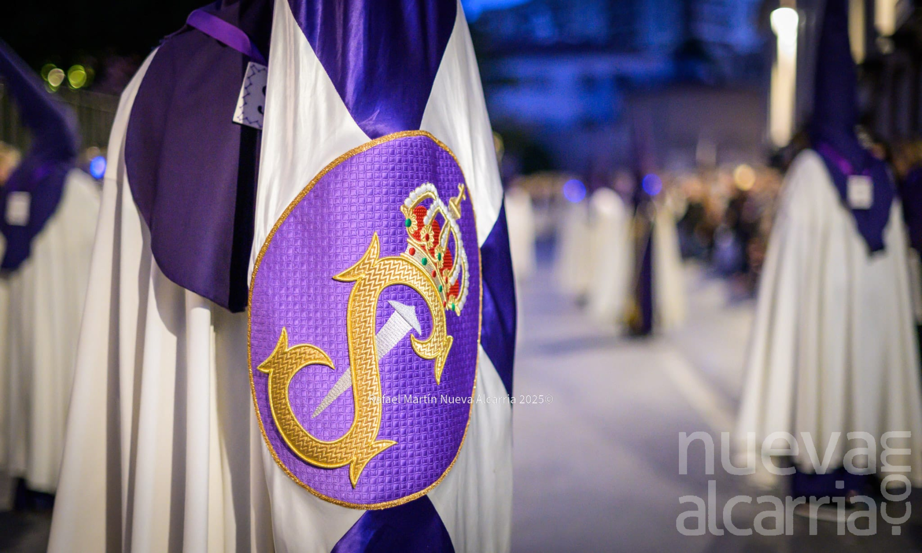 Los nazarenos de la Cofradía de Nuestro Padre Jesús Nazareno, vestidos con sus túnicas moradas y cíngulos dorados, avanzaban con recogimiento. Uno de los momentos más humanos de la noche lo protagonizó un joven nazareno de mirada seria y concentrada que sujetaba con fuerza la cuerda del paso, transmitiendo toda la responsabilidad y devoción de su cofradía.