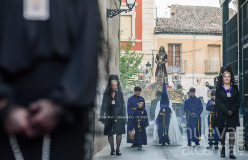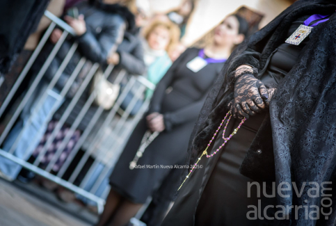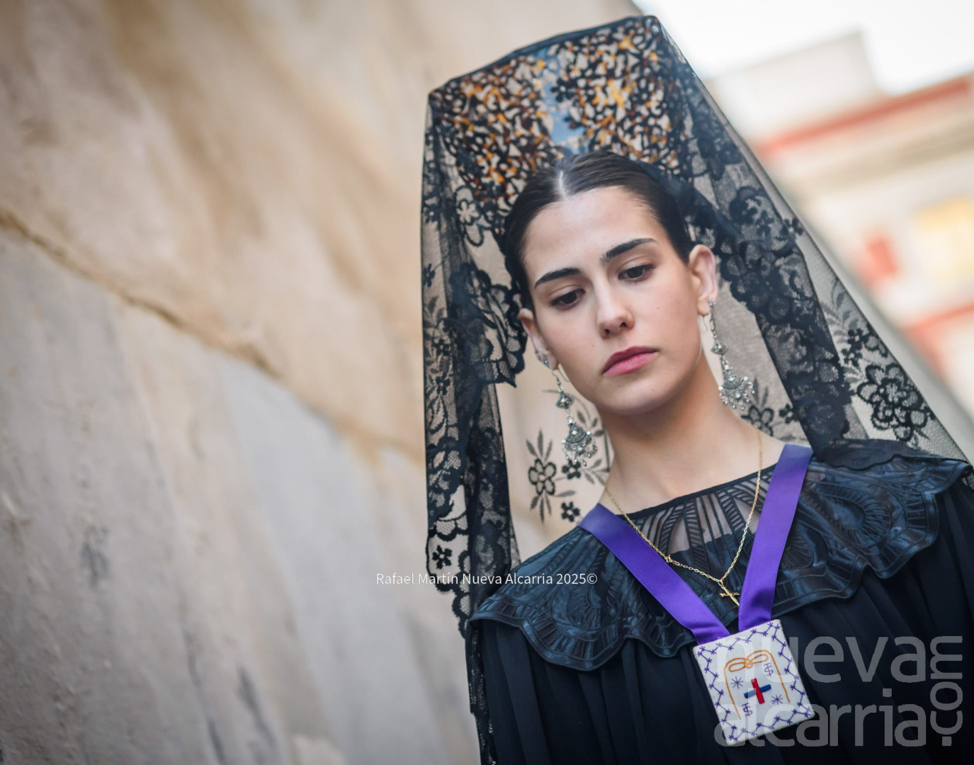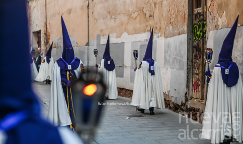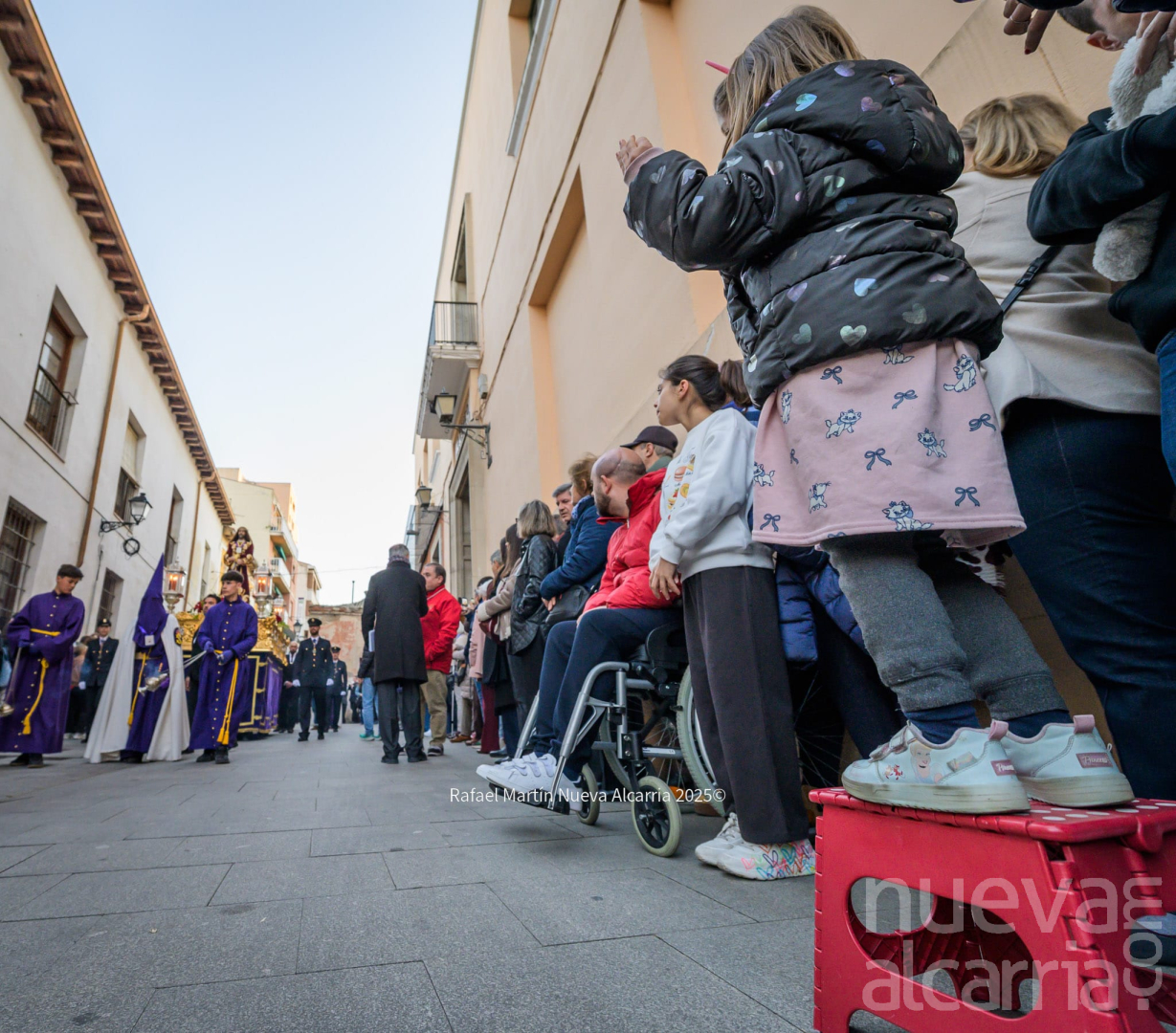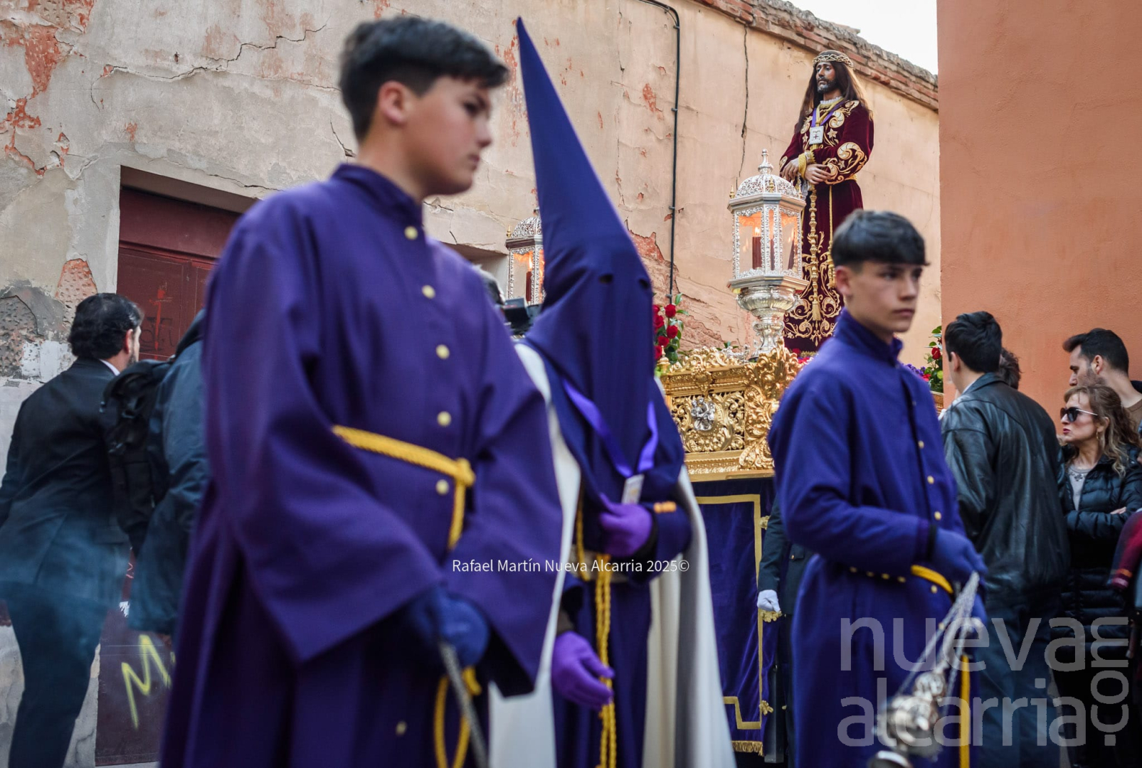 Los nazarenos de la Cofradía de Nuestro Padre Jesús Nazareno, vestidos con sus túnicas moradas y cíngulos dorados, avanzaban con recogimiento. Uno de los momentos más humanos de la noche lo protagonizó un joven nazareno de mirada seria y concentrada que sujetaba con fuerza la cuerda del paso, transmitiendo toda la responsabilidad y devoción de su cofradía.