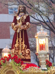 El Cristo lucía majestuoso sobre su trono dorado: túnica de terciopelo granate ricamente bordada en oro, corona de espinas y las manos cruzadas sobre el pecho. Los faroles plateados, encendidos con velas rojas, iluminaban su rostro y creaban un juego de luces y sombras que emocionaba a quien lo miraba. Las flores rojas adornaban el paso con elegancia, contrastando con el oro y el morado del conjunto.