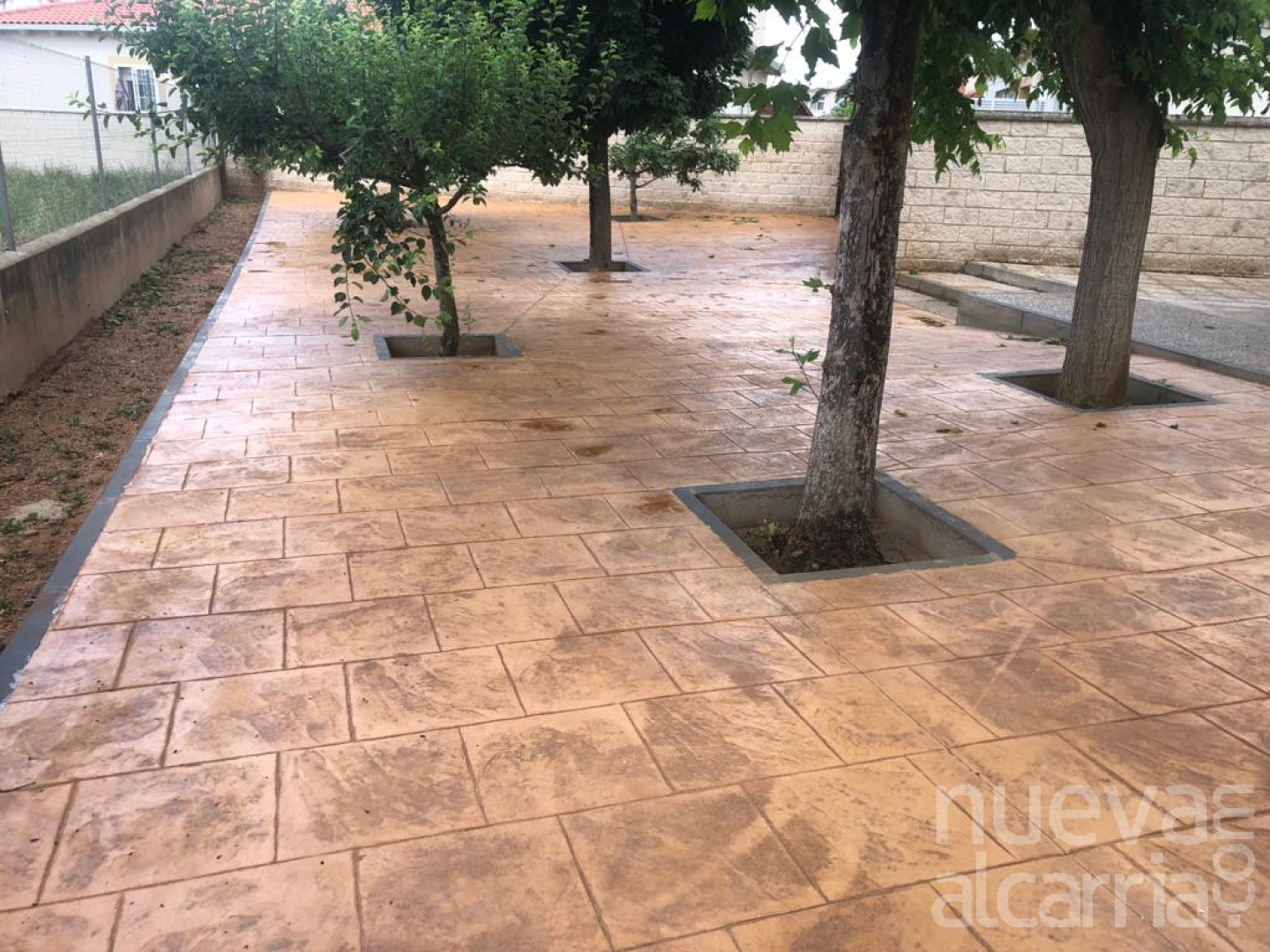 Para ello, se ha realizado una pavimentación del terreno con hormigón impreso, previa ejecución de los bordes y la colocación de alcorques con bordillo prefabricado de hormigón, otorgando a los árboles la protección y el espacio que necesitan para desarrollarse.