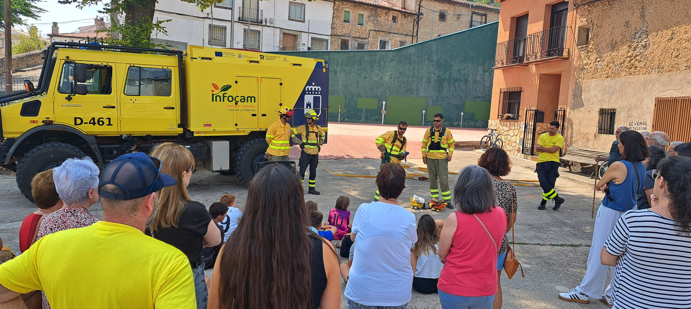Un grupo de niñas y niños del Recuenco han recibido la visita del retén de incendios forestales ubicado en Villanueva de Alcorón, con el objetivo de que pudieran conocer de primera mano el trabajo que desarrollan las personas dedicadas a la lucha contra el fuego en la provincia.