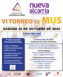 El próximo sábado, el Centro San José de Guadalajara será el escenario del VI Torneo de Mus “Nueva Alcarria”, un campeonato que reunirá a los mejores jugadores de la provincia, también se desplazarán parejas de la zona centro del país, el evento estará acompañado por la 3ª Gala del Circuito Provincial de Mus, organizada por la Diputación de Guadalajara.