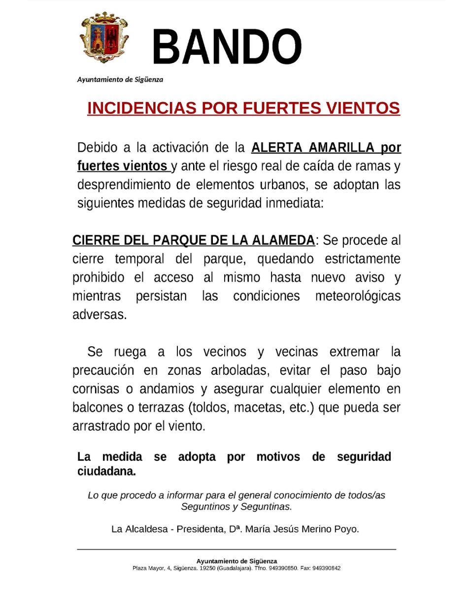 En Sigüenza, el Ayuntamiento ha activado medidas de seguridad inmediatas ante el riesgo de caída de ramas y desprendimiento de elementos urbanos. Se ha procedido al cierre temporal del parque de la Alameda, prohibiendo el acceso mientras persistan las condiciones meteorológicas adversas. El bando municipal ruega a los vecinos extremar la precaución en zonas arboladas, evitar el paso bajo cornisas o andamios y asegurar objetos en balcones y terrazas (toldos, macetas, etc.) que puedan ser arrastrados por el viento. La alcaldesa, María Jesús Merino Poy o, firmó el aviso “por motivos de seguridad ciudadana”.