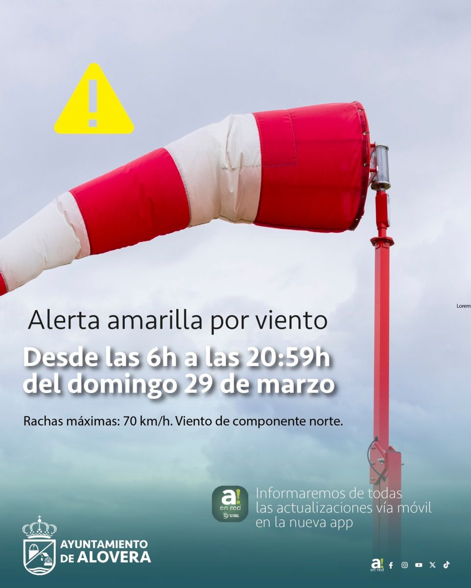 En Alovera, el Ayuntamiento ha activado también la alerta amarilla por viento emitida por la Agencia Estatal de Meteorología (AEMET). La previsión afecta al municipio desde las 6:00 hasta las 20:59 horas, con rachas máximas previstas de hasta 70 km/h y viento de componente norte. Las autoridades locales recomiendan a los vecinos extremar la precaución, especialmente en zonas arboladas, y seguir las actualizaciones a través de la aplicación municipal y los canales oficiales para evitar riesgos derivados de posibles desprendimientos o caída de objetos.
