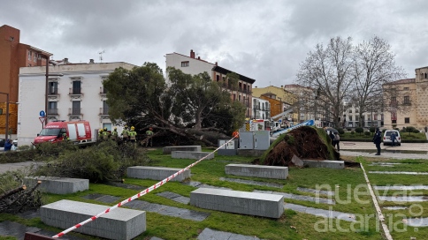 El viento derrumba un gran pino en la Plaza de España de Guadalajara