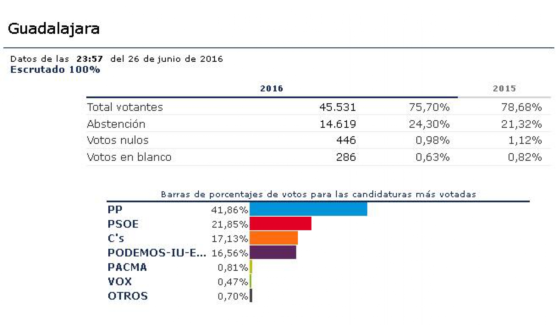 En Guadalajara capital gana el PP, le sigue el PSOE y C's es la tercera fuerza más votada