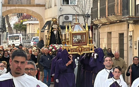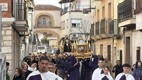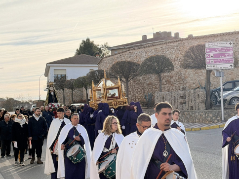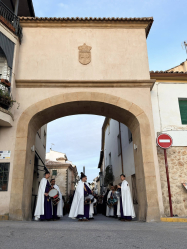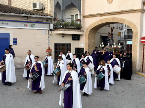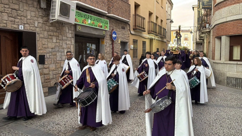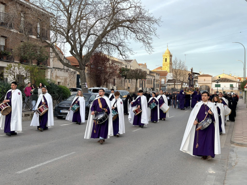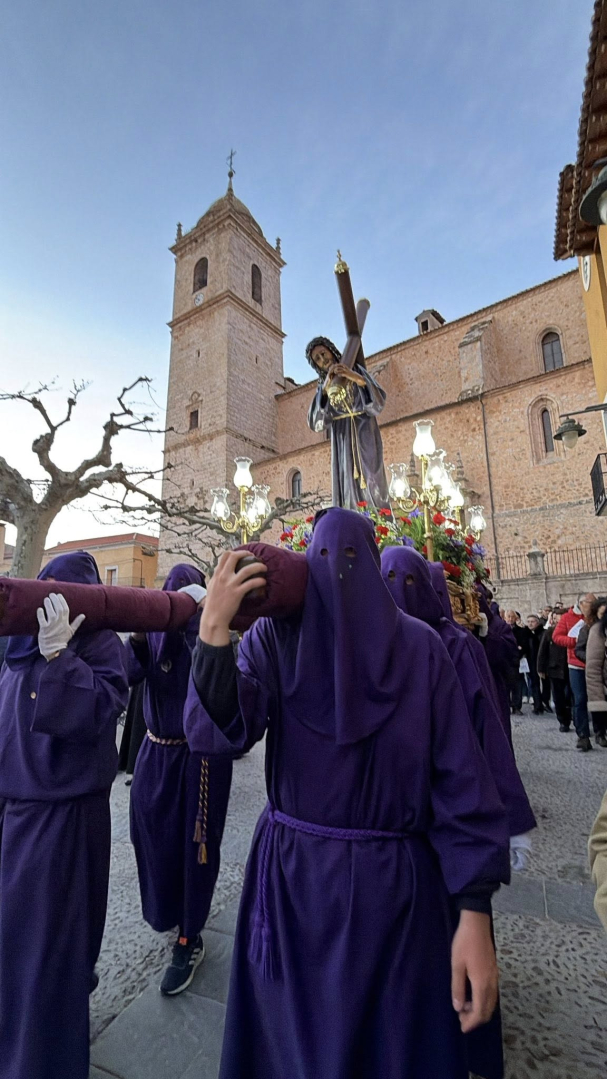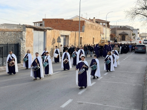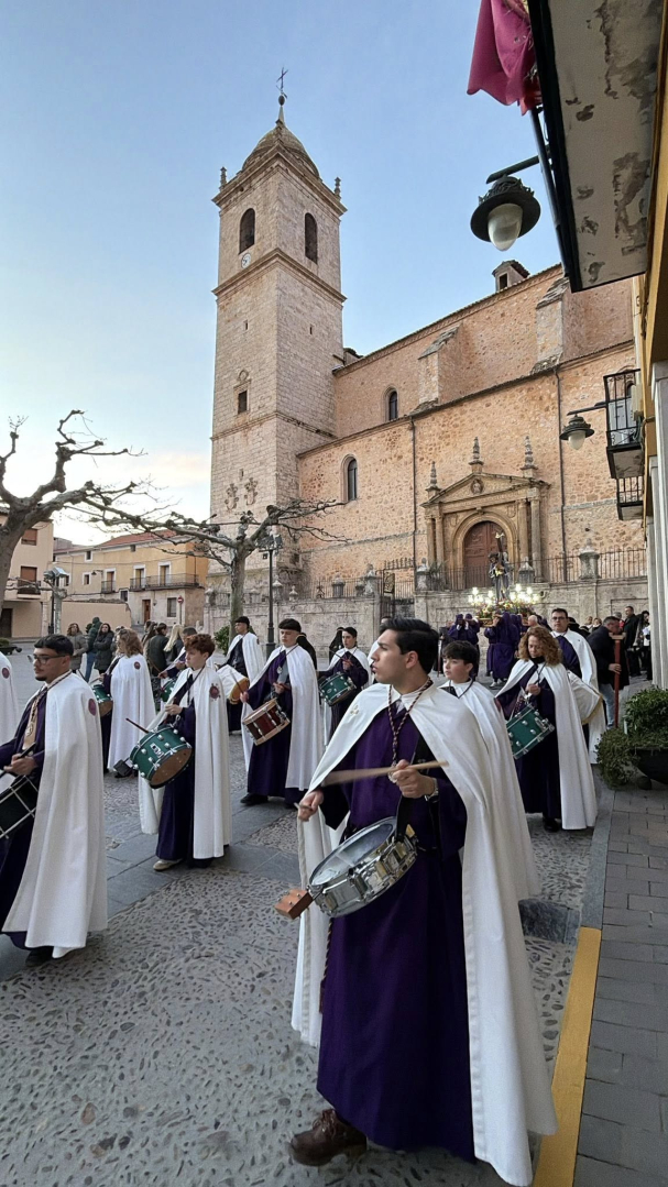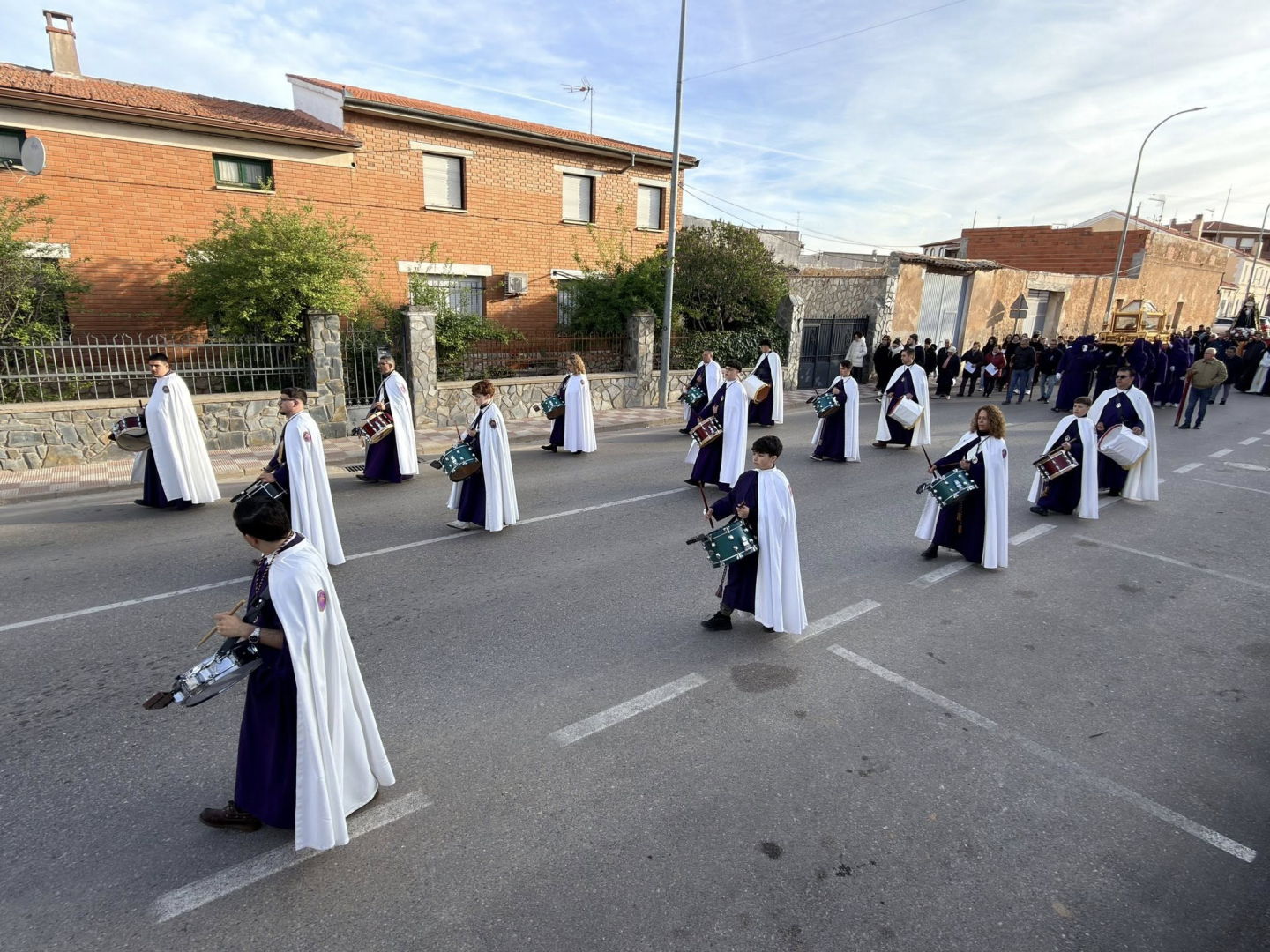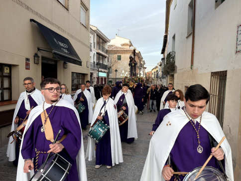 Los nazarenos de túnica morada y capirote blanco avanzaban despacio, algunos descalzos sobre el empedrado frío. El sonido grave y constante de los tambores de la Banda de Cornetas y Tambores marcaba cada paso como un latido colectivo. No hacía falta más. El silencio de las calles aún envueltas en penumbra, el olor a incienso y cera, y esa luz tenue del amanecer que empezaba a tocar los tejados bastaban para que todo Mondéjar sintiera la Pasión en su propia piel.