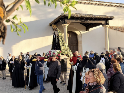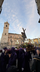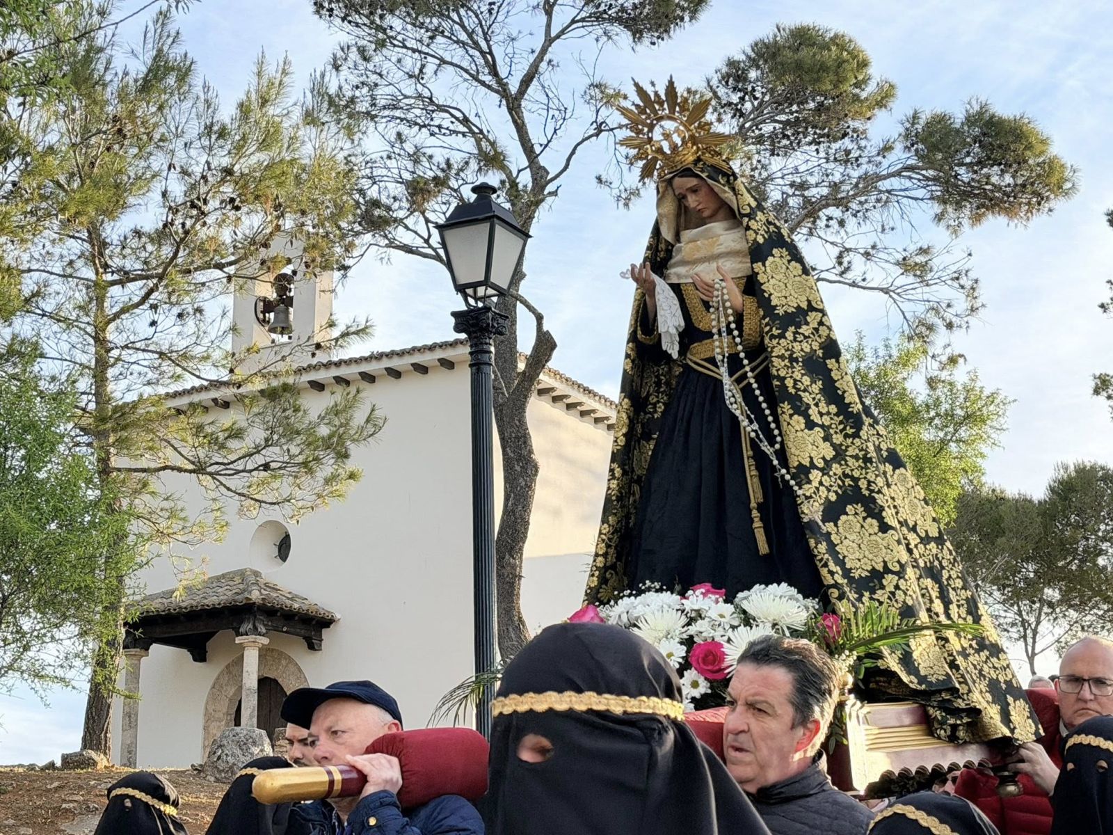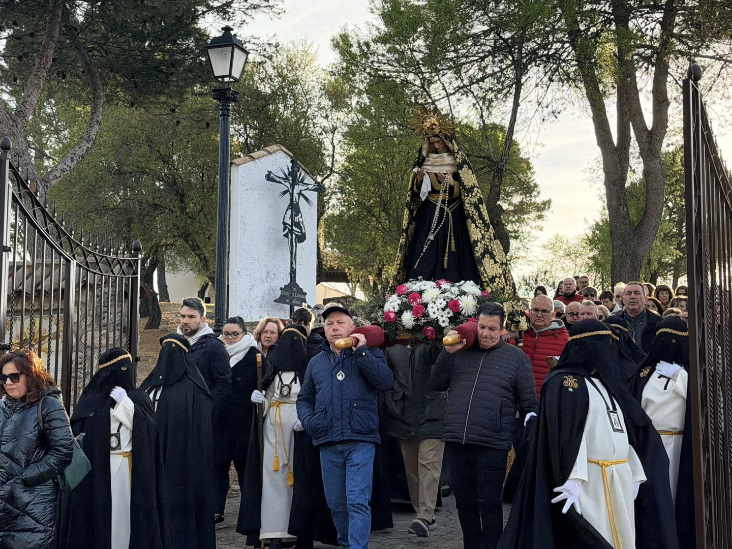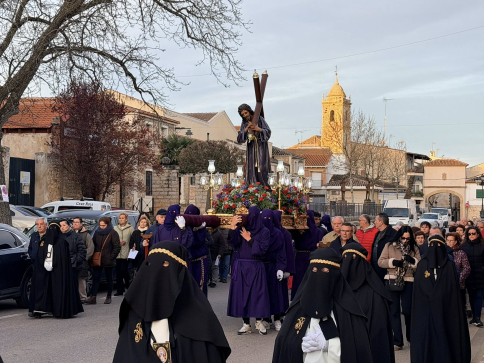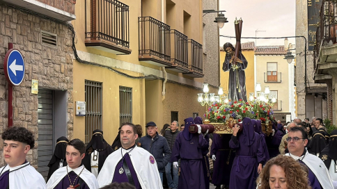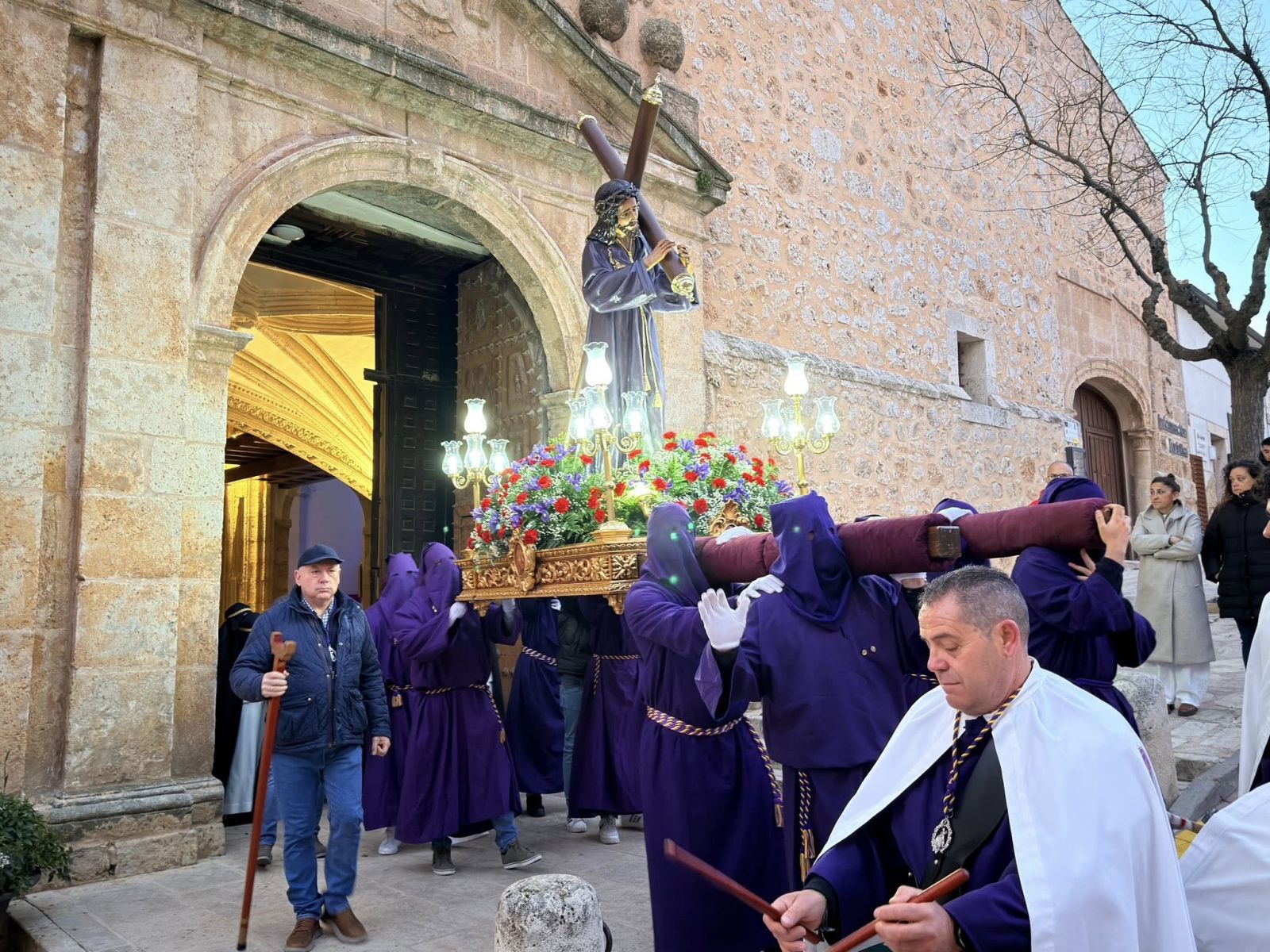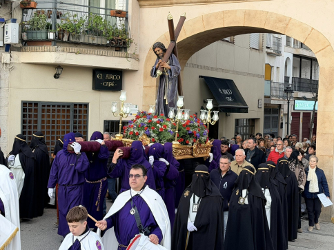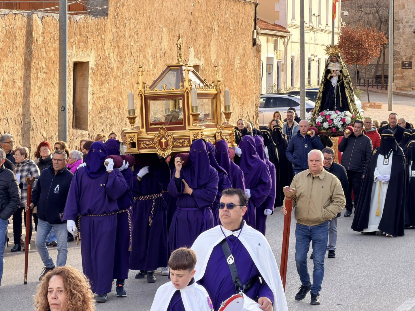 Desde la Iglesia Parroquial salió Jesús el Nazareno, cruz a cuestas, cargado con ese peso que parece llevarse también el de todo el pueblo. Detrás, la Virgen del Encuentro, hermosa y dolorida bajo su manto negro y oro, y cerrando el cortejo el Santo Sepulcro, sobrio y silencioso, como un último suspiro antes de la Resurrección.