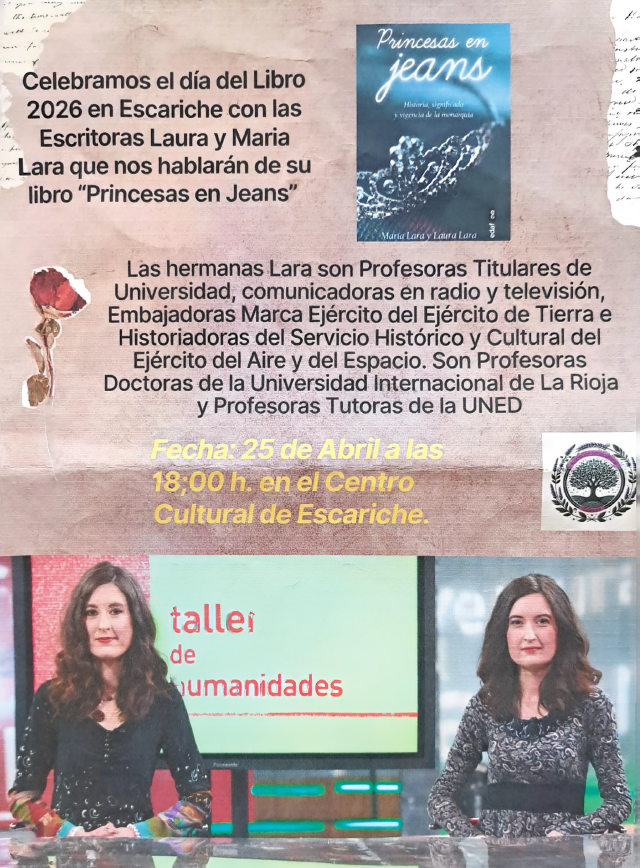 En Escariche, un pueblo de la Alcarria baja que vive con los pies en su terruño, la Asociación Sociocultural, con el respaldo del Ayuntamiento, ha organizado para el próximo sábado 25 de abril, a las 18.00 horas en el Centro Cultural de Escariche, una jornada que ya se siente especial. Coincidiendo con la misa mayor de la Virgen de las Angustias, llega el Día del Libro 2026 con dos invitadas de excepción: las hermanas Laura y María Lara Martínez, las historiadoras de Azuqueca que han puesto a las mujeres en el centro de la Historia con sus libros y conferencias. Allí presentarán su último libro "Princesas en jeans".