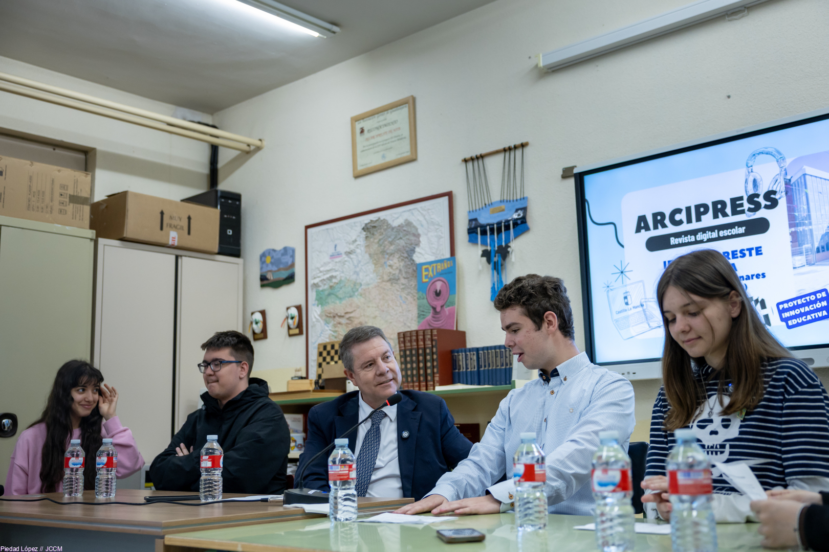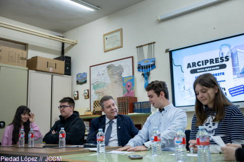 El presidente de Castilla-La Mancha, Emiliano García-Page, mantuvo, en el día de ayer, un encuentro con alumnos y alumnas de 4º ESO y 1º de Bachillerato II Diversificación del IES Arcipreste de Hita, quienes le han entrevistado para su proyecto de revista digital. Asimismo, fue entrevistado por alumnos y alumnas del CEIP “La Paloma” de la misma localidad guadalajareña, para su proyecto de radio escolar “Palomitas FM”.