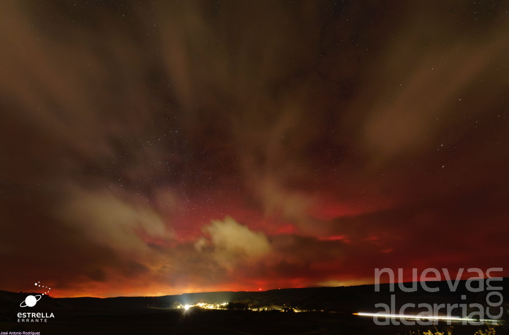 Rodríguez relata que recibió el aviso de un amigo sobre las 22.00 horas del lunes, cuando estaba a punto de cenar, y decidió salir a las eras de Tobillos “con lo primero que pilló del armario”, acompañado por su pareja y sus mascotas. Desde allí obtuvo una imagen en la que se aprecia Mazarete al fondo, la estela de un coche en la carretera nacional y, sobre las nubes, “el tono carmesí de la aurora” mezclado con las estrellas.