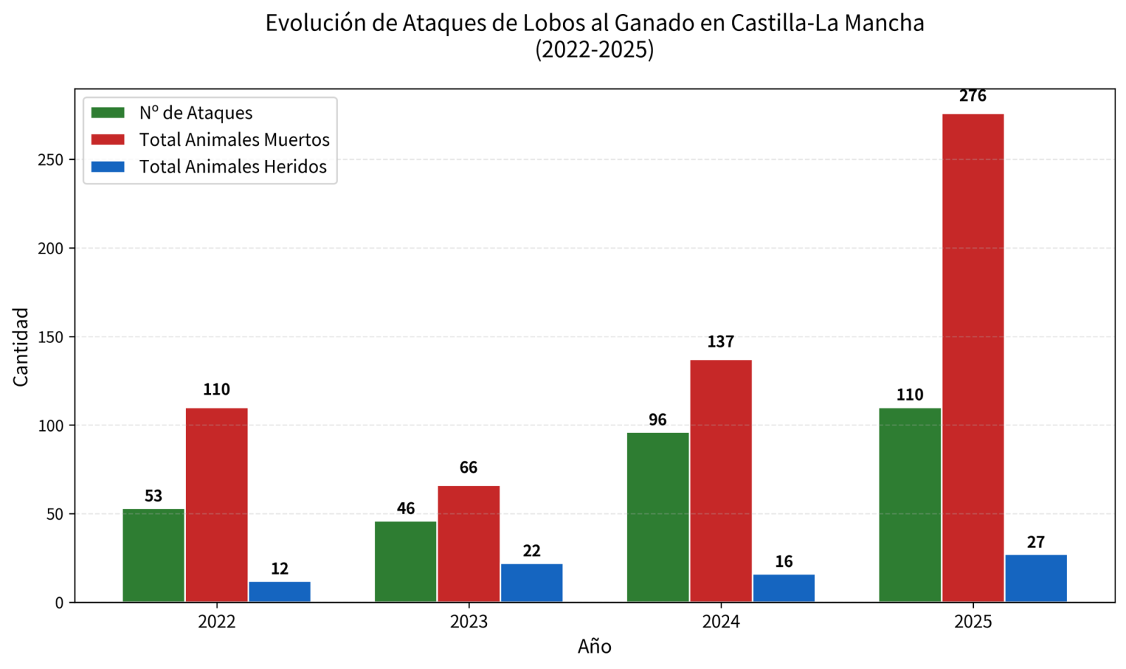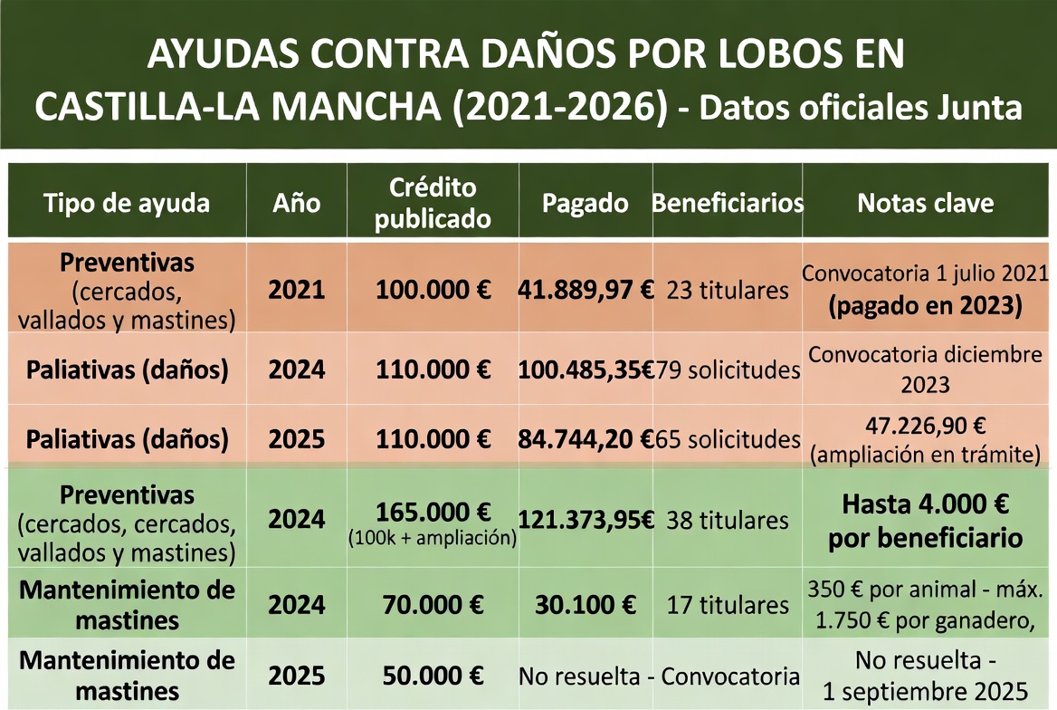 La Junta de Castilla-La Mancha ha destinado más de 378.593 euros en los últimos 5 años (2021-2025) para paliar los daños causados por el lobo ibérico, beneficiando a más de 220 ganaderos a través de indemnizaciones directas y medidas preventivas.