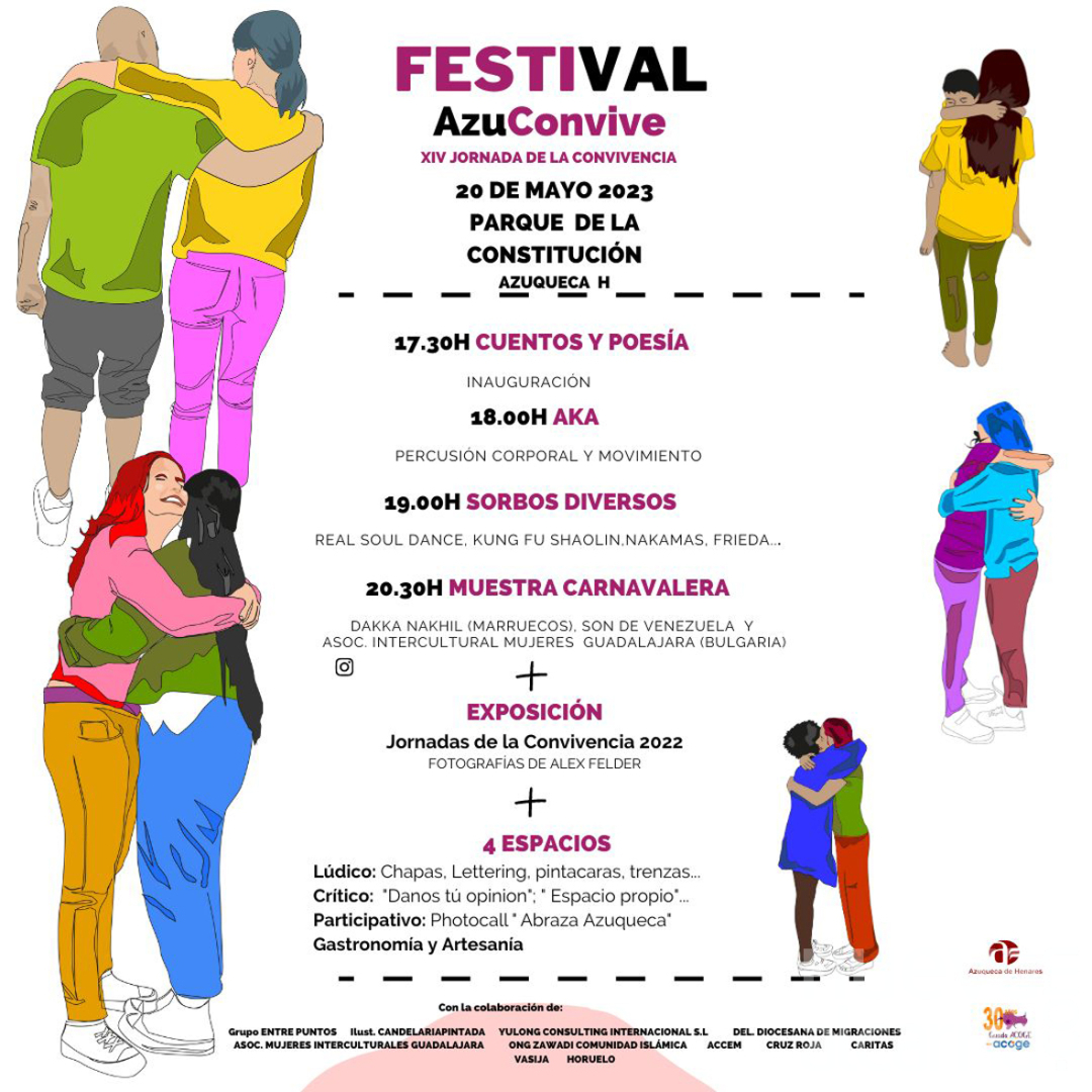 El Festival AzuConvive, que impulsa el Ayuntamiento de Azuqueca a través de la asociación Guada Acoge, cuenta con la colaboración de Accem, Cáritas, Cruz Roja, Vasija, Horuelo, del grupo Entre Puntos, las ilustraciones de Candelariapintada, Yulong Consulting Internacional S.L., la Delegación Diocesana de Migraciones, la Asociación de Mujeres Interculturales de Guadalajara, la ONG Zawadi y la comunidad islámica.