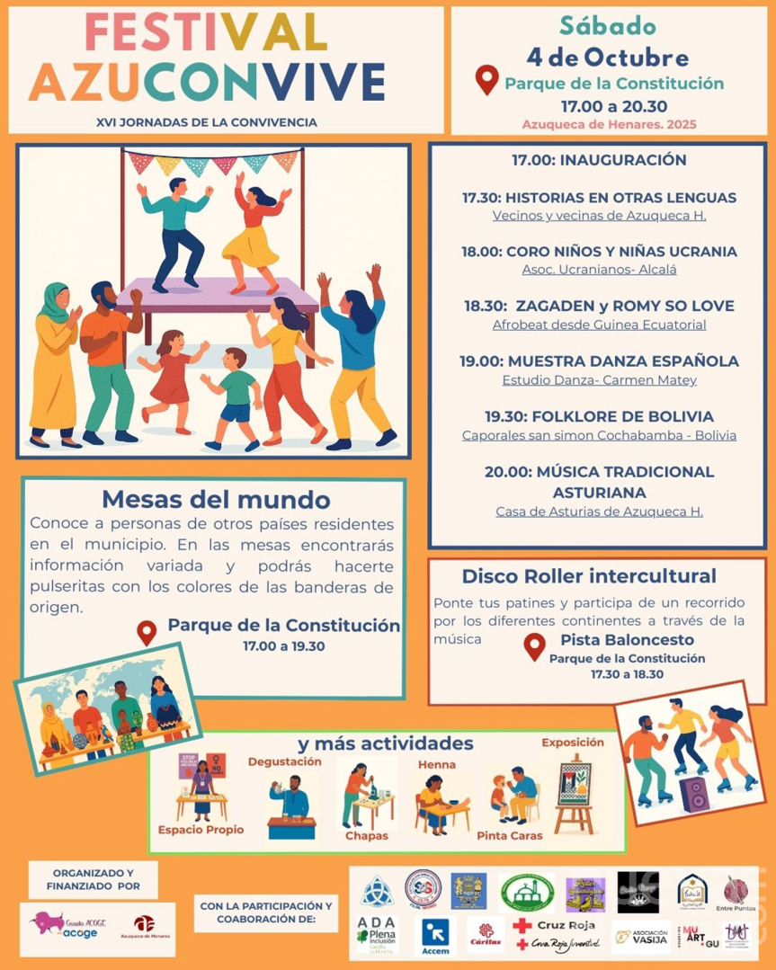 Este sábado, 4 de octubre, entre las 17 y las 20:30 horas, se celebra en el parque de La Constitución el Festival Azuconvive, en el marco de las XVI Jornadas de la Convivencia de Azuqueca de Henares. La concejala de Cohesión Social, Beatriz Cano, explica que el objetivo de esta propuesta es "facilitar el intercambio cultural, el conocimiento de distintas culturas, a través de vecinas y vecinos de Azuqueca de Henares". El Festival lo organiza Guada Acoge con el apoyo del Ayuntamiento y la colaboración de un buen número de asociaciones.