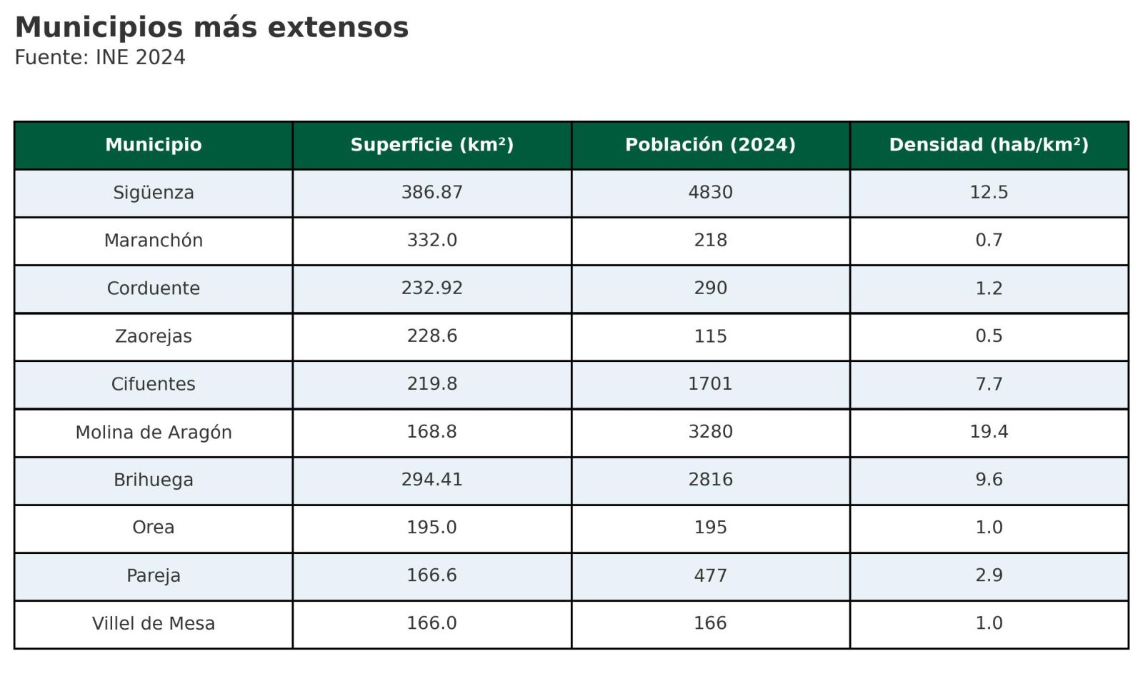 - El municipio más extenso de la provincia es Sigüenza (386,87 km²), con un territorio casi cuatro veces mayor que el de Barcelona (101,9 km²), y una densidad de 12,48 hab./km² .