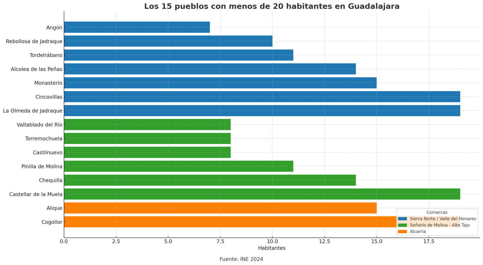 Según los datos oficiales del Instituto Nacional de Estadística (INE 2024), quince municipios de la provincia de Guadalajara luchan por subsistir con menos de 20 residentes. Esta realidad de mínimos poblacionales coexiste con una geografía descomunal: muchos de sus términos, como Sigüenza (386,87 km²), gestionan extensiones que superan a capitales como Barcelona (101,9 km²).
