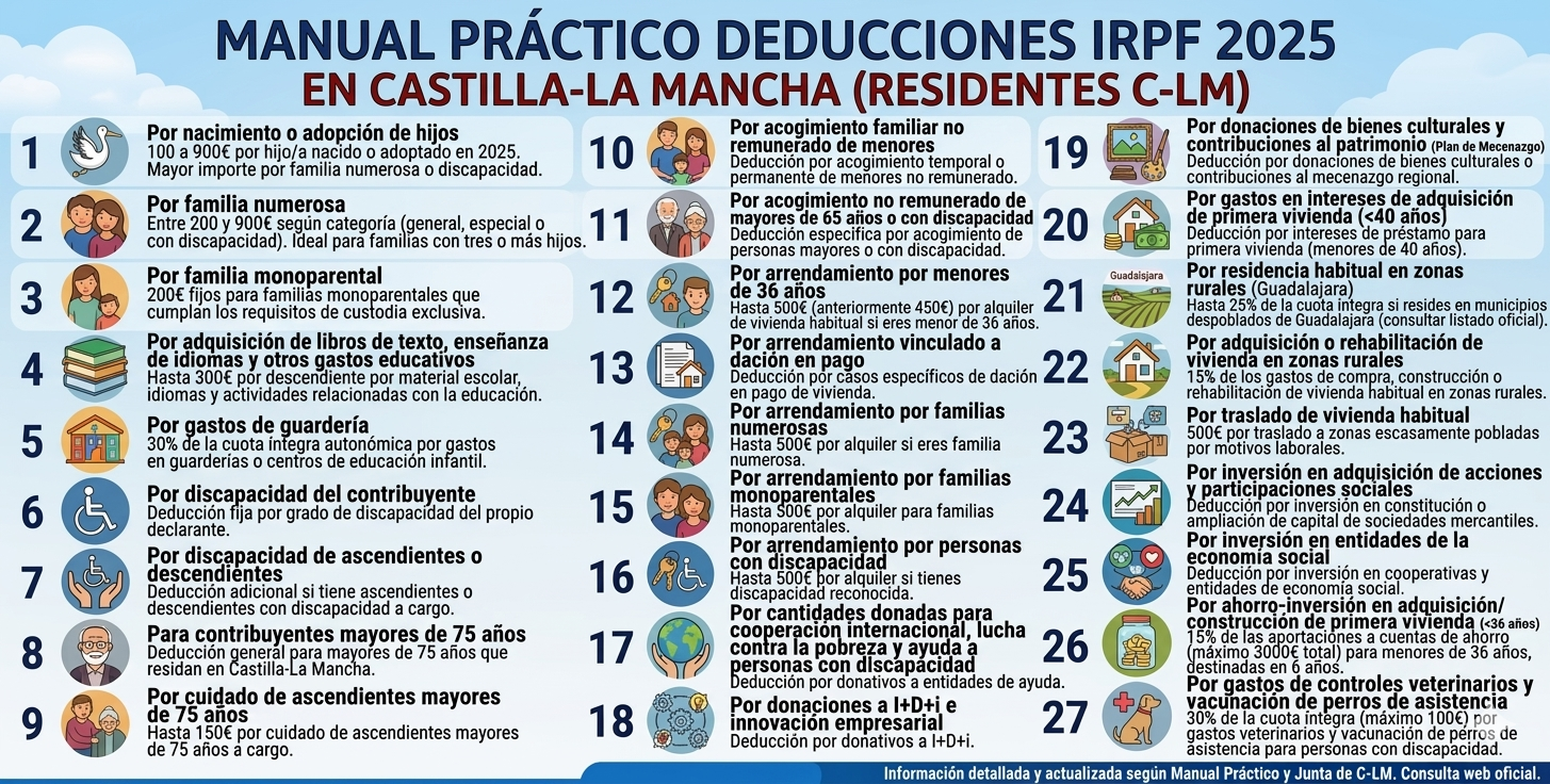 Estas deducciones IRPF 2025 son exclusivas para residentes en Castilla-La Mancha y se aplican sobre la cuota íntegra autonómica.