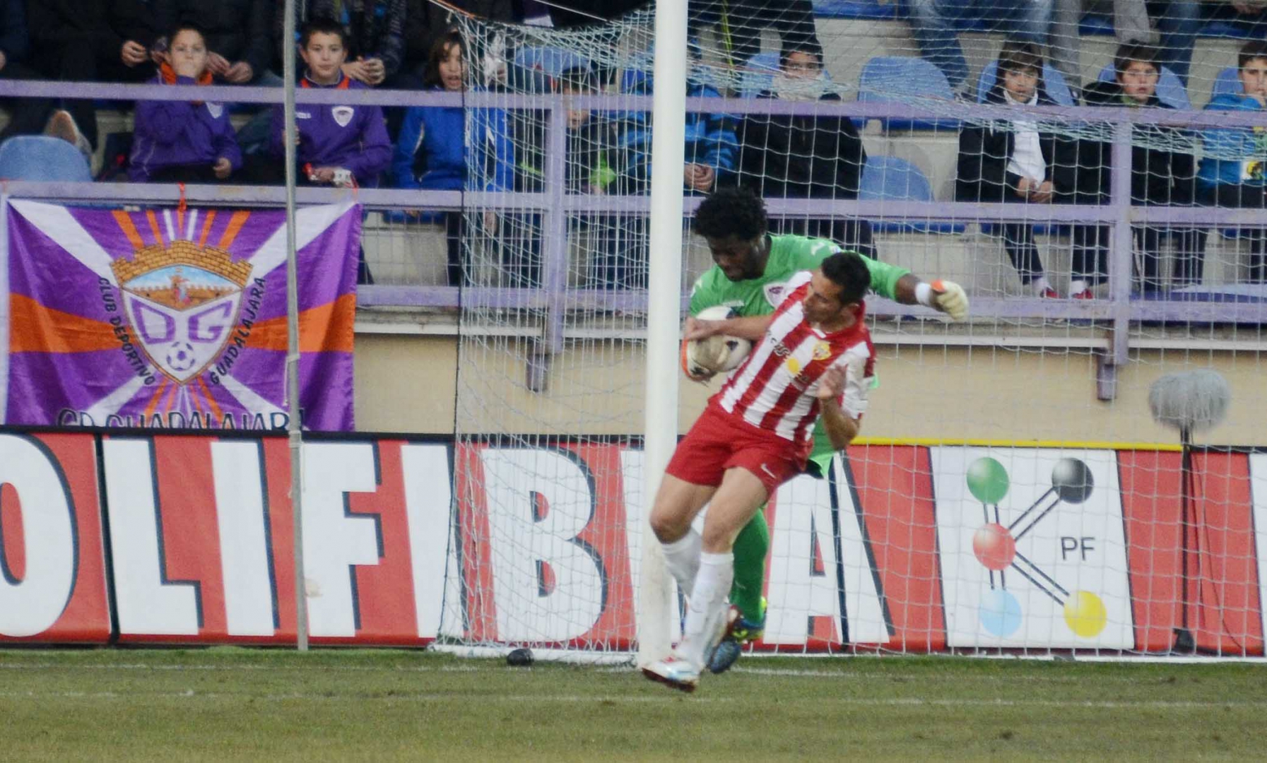Hasta entonces, el cuadro de Carlos Terrazas había estado poco menos que impecable. Normalmente los partidos empiezan con 0-0 pero este no. Este empezó con 1-0 puesto que a los 39 segundos, Javi Barral ya había perforado la meta de Esteban con un certero cabezazo a centro de Álvaro Antón en una falta lateral. Los morados dominaban y el Almería optaba por la vía de la paciencia cuando lograba obtener la posesión. Transiciones largas pero inocuas para la meta alcarreña.
