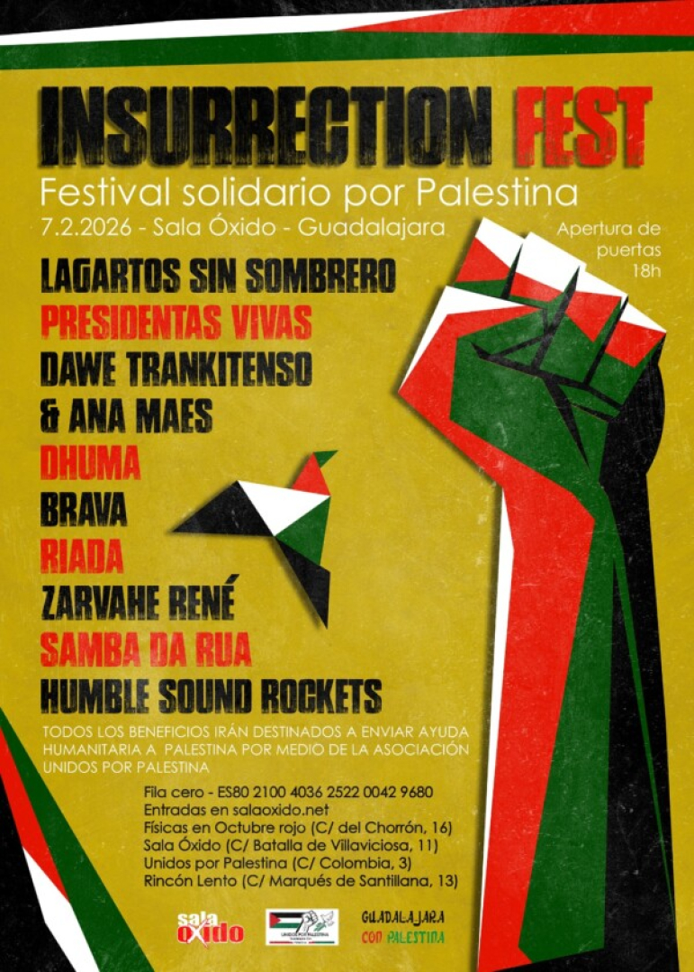 La plataforma Guadalajara con Palestina ha presentado el Insurrection Fest, un festival solidario que se celebrará el próximo 7 de febrero en la Sala Óxido de Guadalajara con el objetivo de recaudar fondos destinados a ayuda humanitaria para la población de Gaza a través de la asociación Unidos por Palestina.