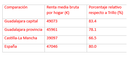 El municipio de Trillo (Guadalajara) presenta una renta media bruta por hogar de 58.814 €, situándose como el referente económico de la provincia y, en términos relativos, muy por encima de los promedios provincial, regional y nacional. Según los últimos datos publicados por el Instituto Nacional de Estadística (INE) -el 21 de octubre de 2025- la renta de los hogares de Trillo es un 16,6% superior a los de la capital provincial, Guadalajara. Es decir, los hogares de Trillo disponen, de media, de unos 9.700 € anuales más que los de la capital provincial.