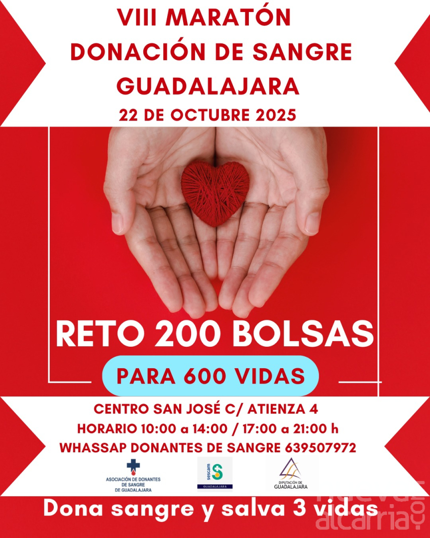 El próximo 22 de octubre, el Centro San José acogerá el VIII Maratón de Donación de Sangre de Guadalajara, una cita solidaria impulsada por la Asociación de Donantes de Sangre de Guadalajara, en colaboración con el SESCAM y la Diputación Provincial. El objetivo es ambicioso: reunir 200 bolsas de sangre, suficientes para salvar 600 vidas.