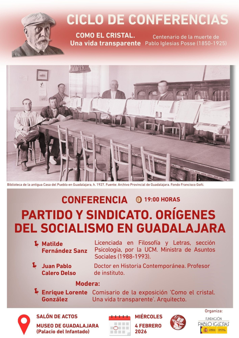 El Salón de Actos del Museo de Guadalajara, en el Palacio del Infantado, acogerá el próximo miércoles 4 de febrero, a las 19:00 horas, la conferencia titulada “Partido y Sindicato. Orígenes del socialismo en Guadalajara”, enmarcada en el ciclo “Como el cristal. Una vida transparente”, organizado con motivo del centenario de la muerte de Pablo Iglesias Posse (1850-1925).