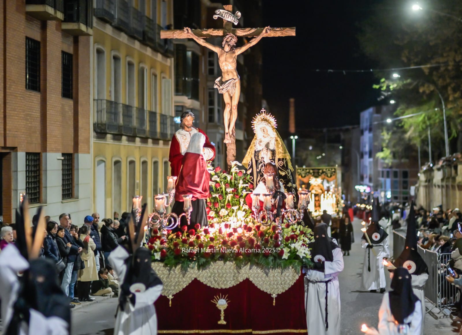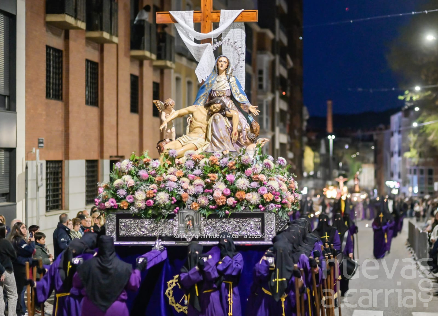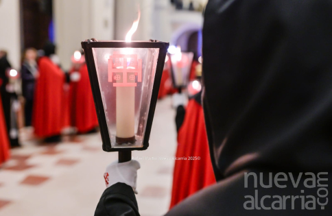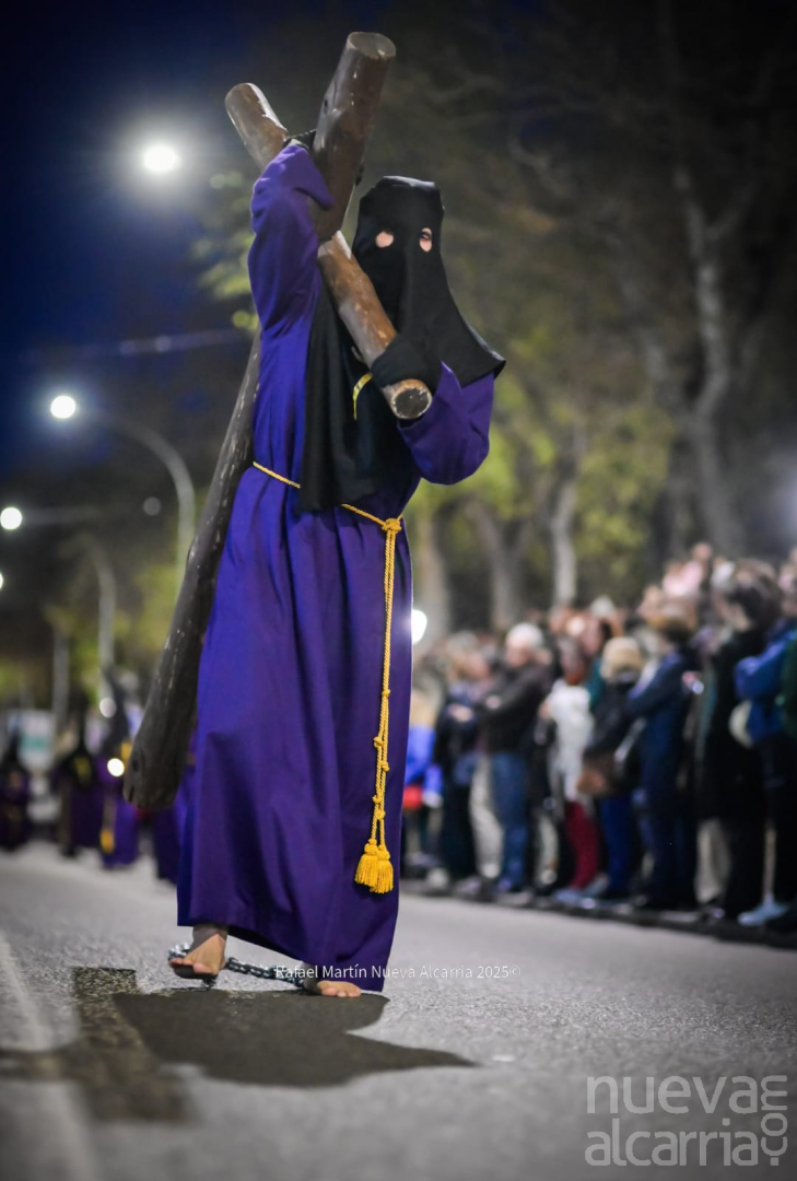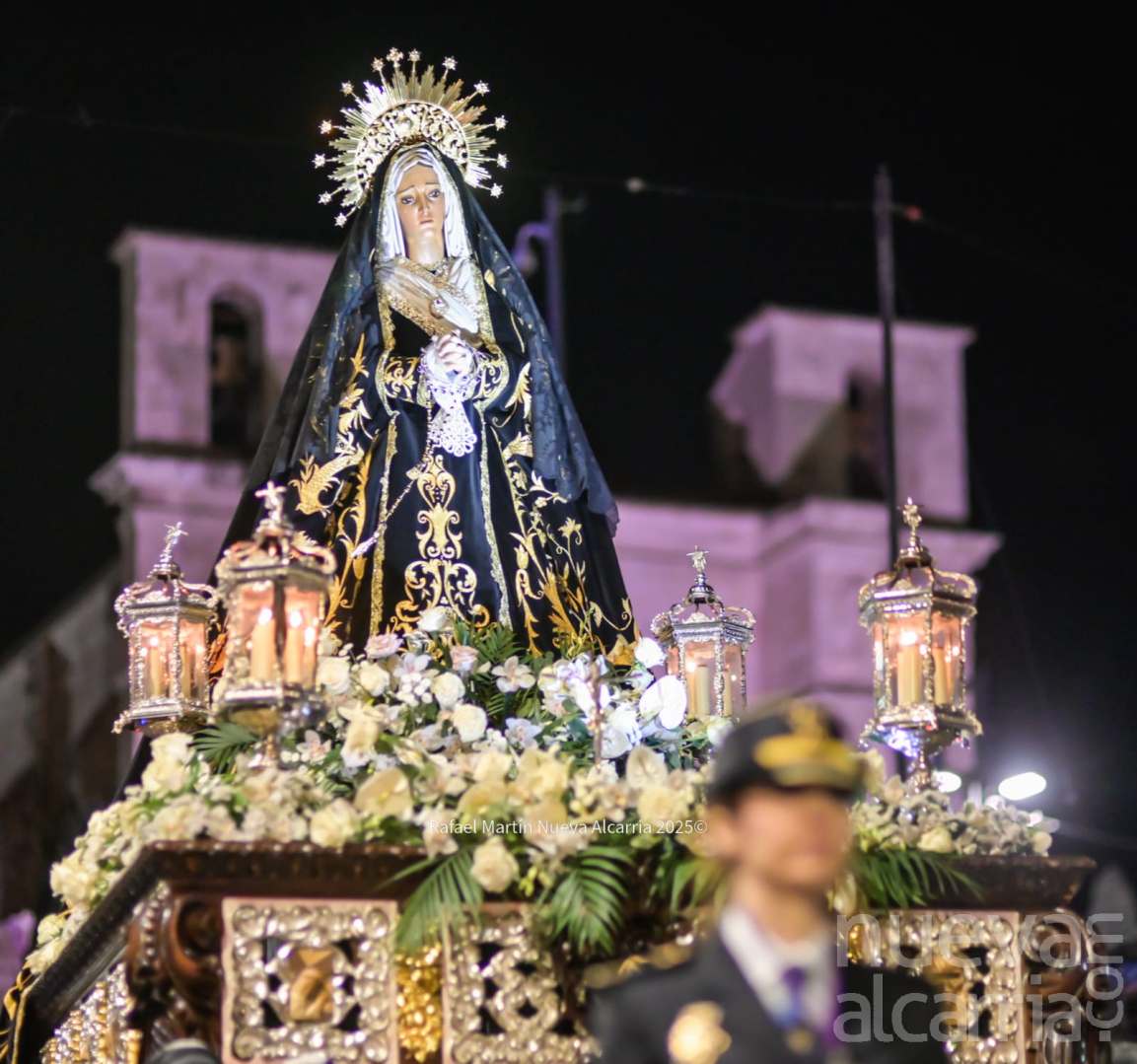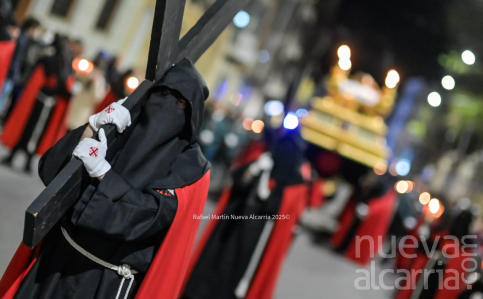 Le siguió la Cofradía de Nuestra Señora de los Dolores, una de las más antiguas de la ciudad, con sede en la propia Concatedral. Portaba el paso del Calvario en la Quinta Palabra y, sobre todo, el palio de su titular, la Virgen de los Dolores del siglo XVII procedente de las Carmelitas Descalzas de San José, flanqueada por San Juan, María Magdalena y María de Cleofás. Los nazarenos cargaban los varales con devoción visible; el palio, iluminado por docenas de cirios, se mecía suavemente entre el público que contenía la respiración.