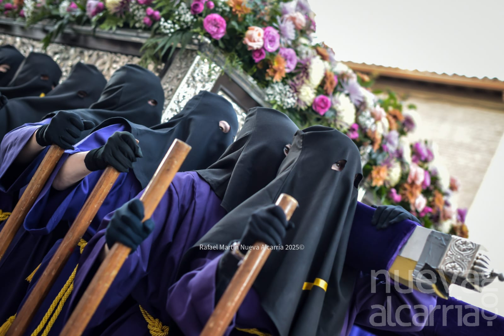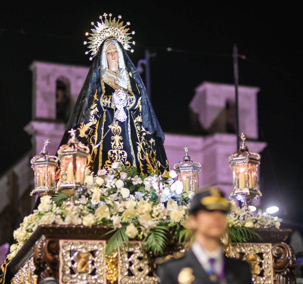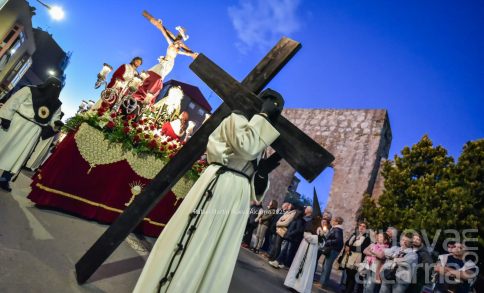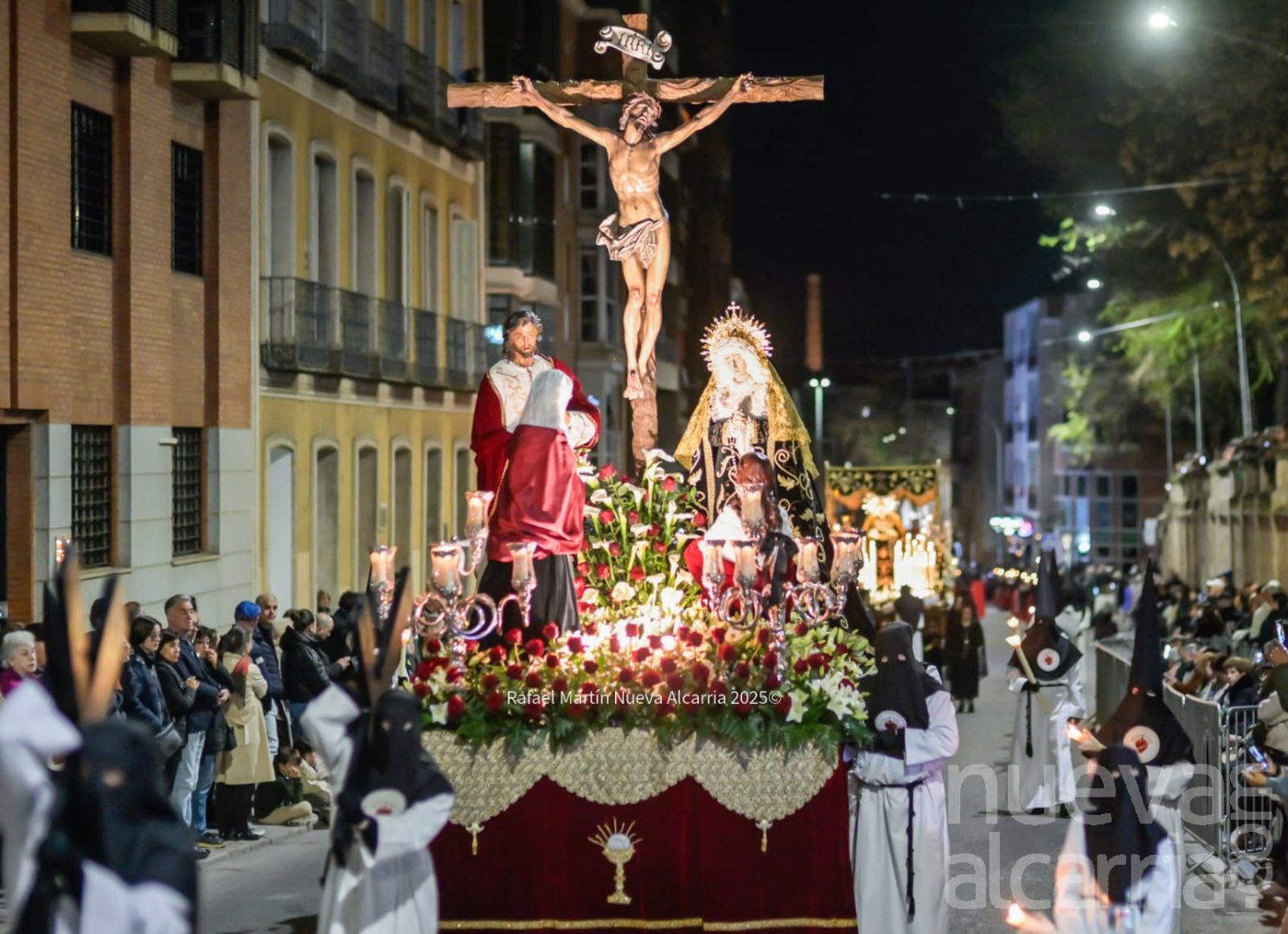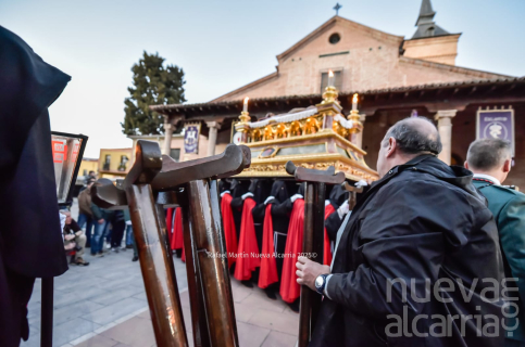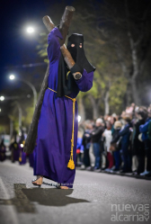 Le siguió la Cofradía de Nuestra Señora de los Dolores, una de las más antiguas de la ciudad, con sede en la propia Concatedral. Portaba el paso del Calvario en la Quinta Palabra y, sobre todo, el palio de su titular, la Virgen de los Dolores del siglo XVII procedente de las Carmelitas Descalzas de San José, flanqueada por San Juan, María Magdalena y María de Cleofás. Los nazarenos cargaban los varales con devoción visible; el palio, iluminado por docenas de cirios, se mecía suavemente entre el público que contenía la respiración.