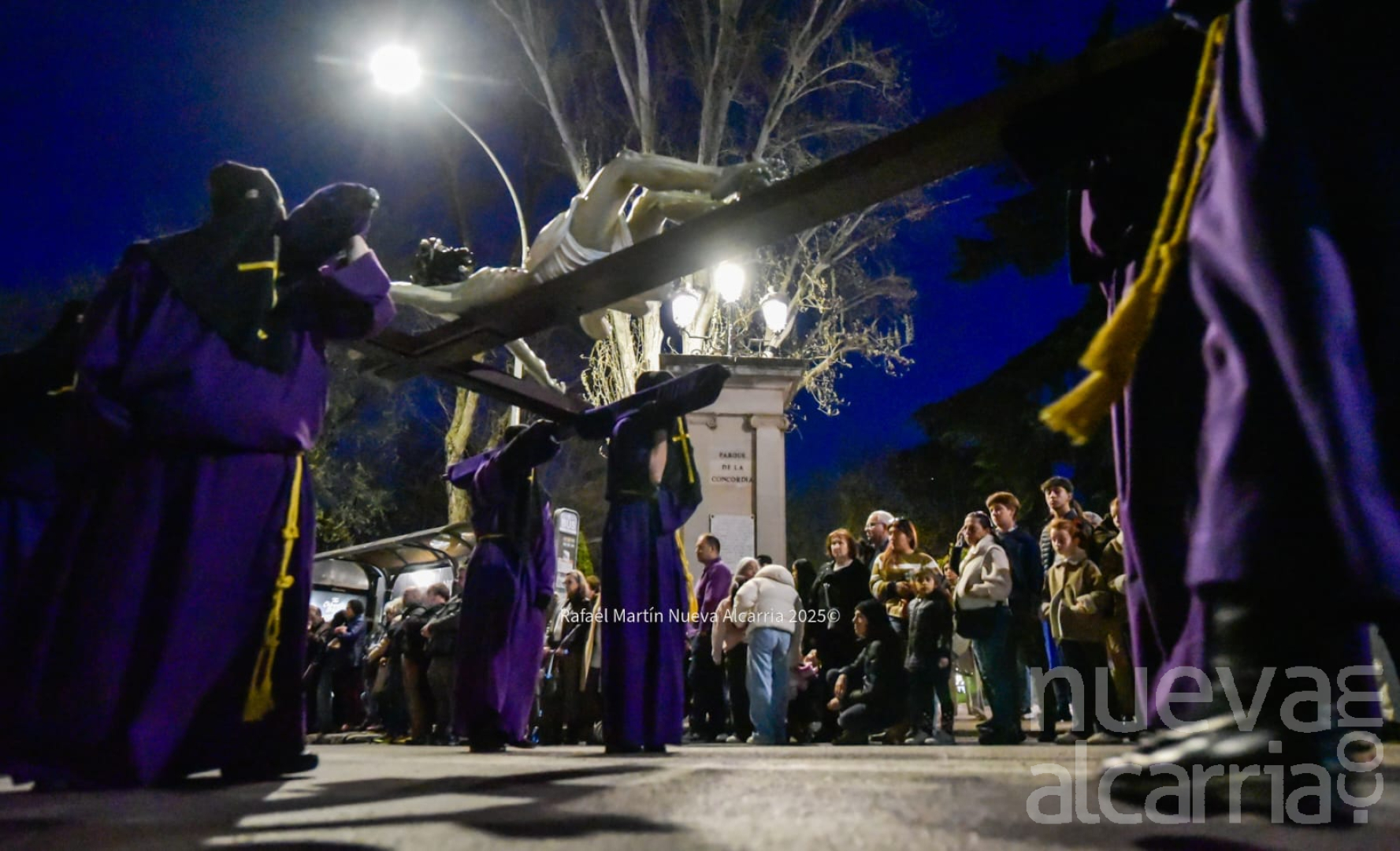 La plaza se llenó desde antes de la hora con vecinos y visitantes que aguardaban en silencio, muchos con velas encendidas o faroles en la mano, mientras el aroma a cera y incienso empezaba a flotar. Abrió el cortejo la Cofradía de la Pasión del Señor, que había salido a las 19:15 desde Santiago Apóstol, con sus tres pasos: el Cristo de la Expiración, La Piedad y Nuestro Padre Jesús de la Pasión, acompañados por su propio grupo de tambores que marcaban un ritmo pausado y solemne. Sus nazarenos, con túnicas moradas y capirotes, avanzaban con la gravedad que exige el momento.