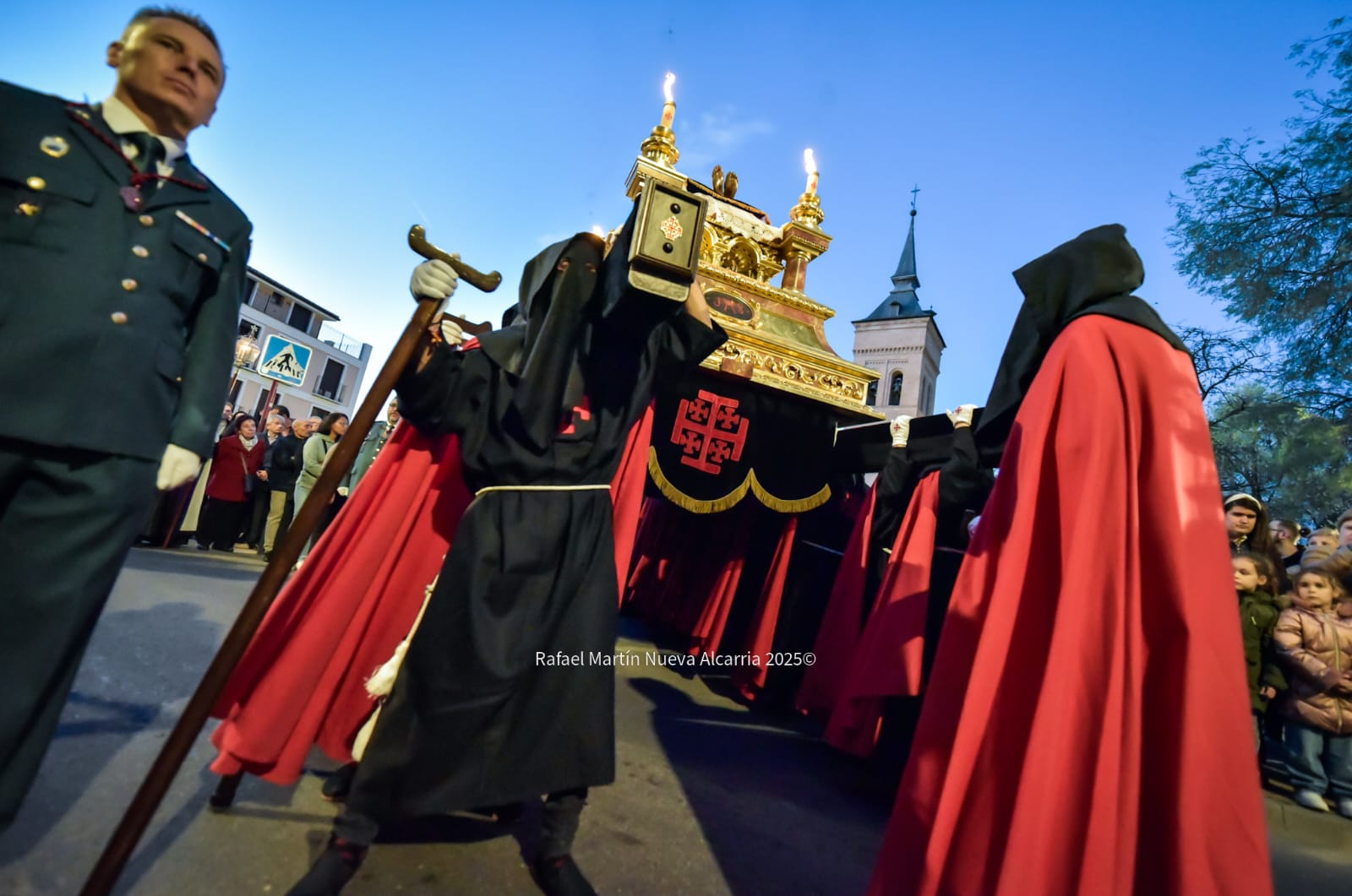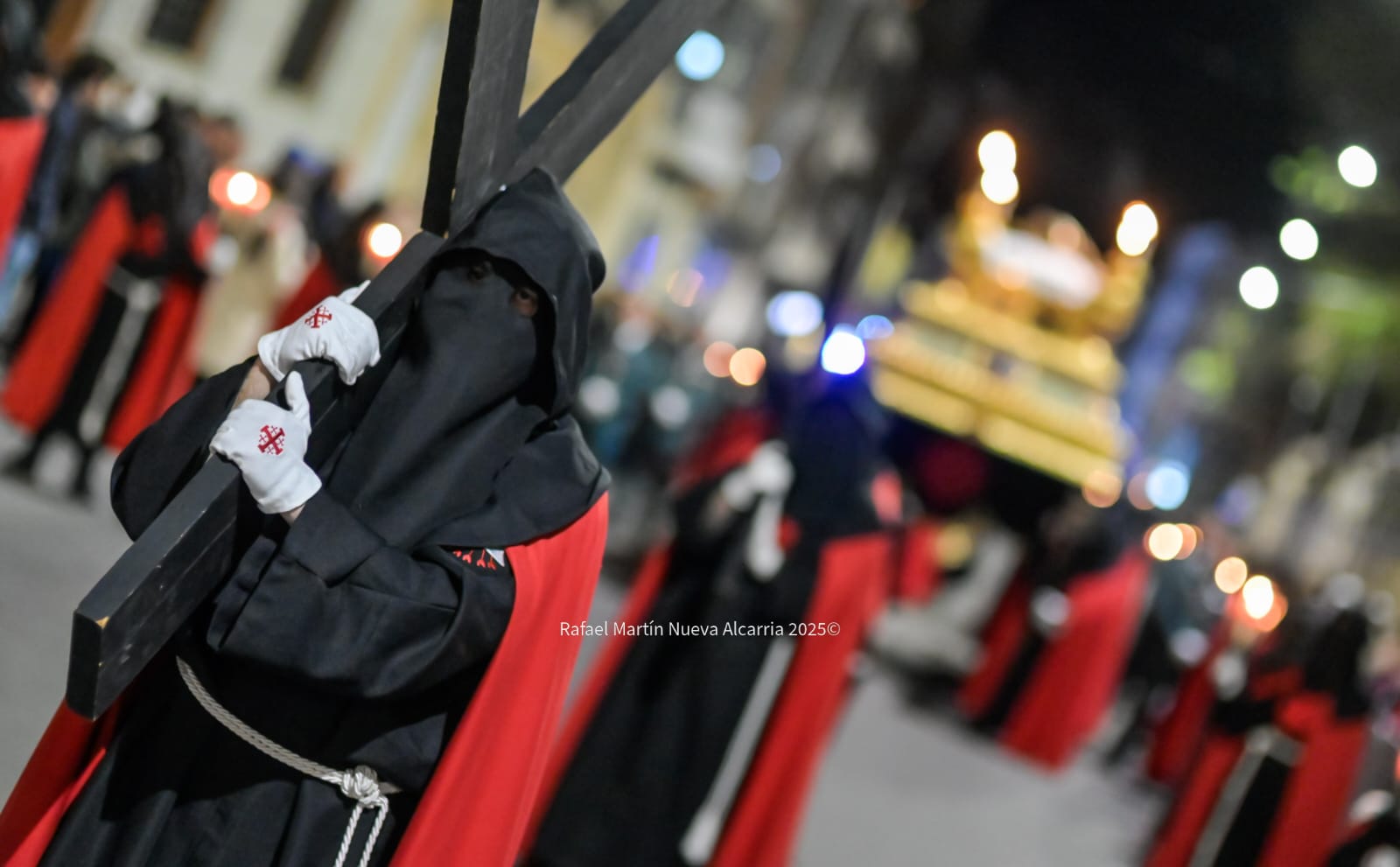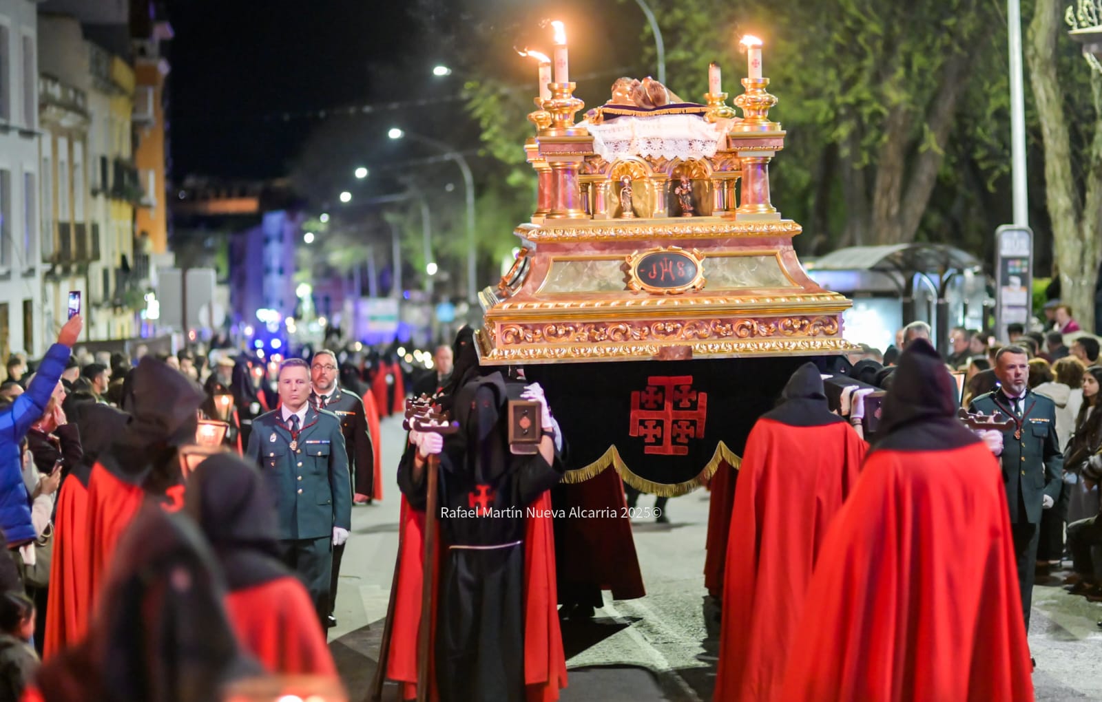 El desfile avanzó por las calles del centro histórico —Plaza de Santa María, Calle Mayor, Plaza de Bejanque y el resto del recorrido oficial— con pasos que brillaban bajo la luz de faroles decorados con la cruz roja de Jerusalén y velas que proyectaban sombras alargadas sobre las fachadas. La multitud, compacta pero respetuosa, aplaudía en silencio al final de cada paso; algunos vecinos asomados a balcones y niños de la mano de sus padres vivían la tradición como un legado familiar.