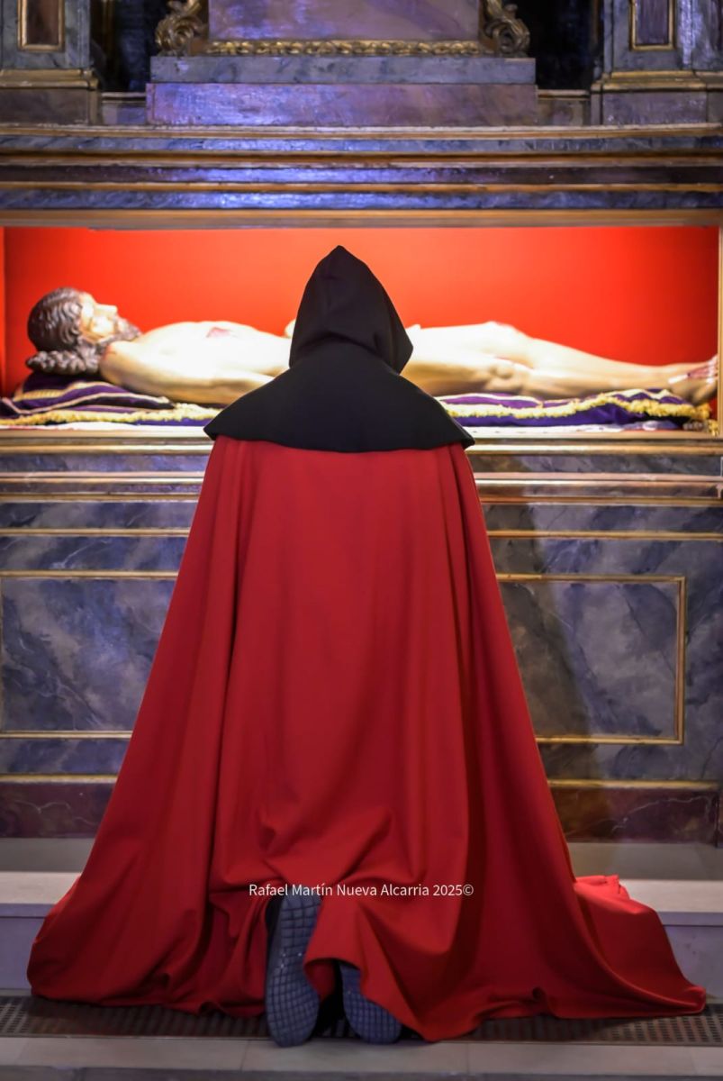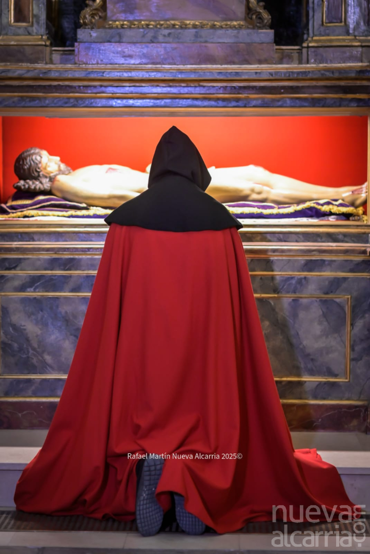 A continuación llegó la Cofradía del Cristo Yacente del Santo Sepulcro, que presentó su imagen titular del Cristo yacente sobre un paso ornamentado con mármol y oro, junto a la Cruz Desnuda de Jerusalén tallada en 1998 por el hermano Demetrio Rojo. El grupo de dulzaineros “Mahurotos” rompió el silencio con su música tradicional, un detalle que muchos cofrades celebraron como el auténtico sonido de la Pasión local. Algunos penitentes descalzos, con cadenas en los tobillos, cargaban cruces pesadas de madera; el sudor en la frente hablaban de penitencia real.