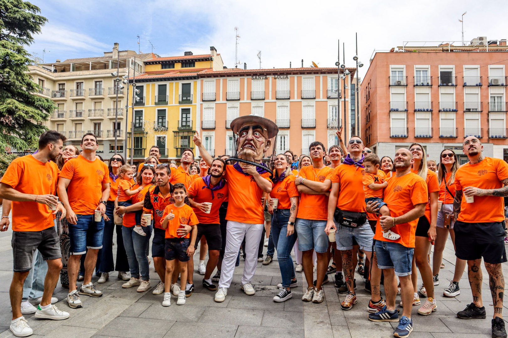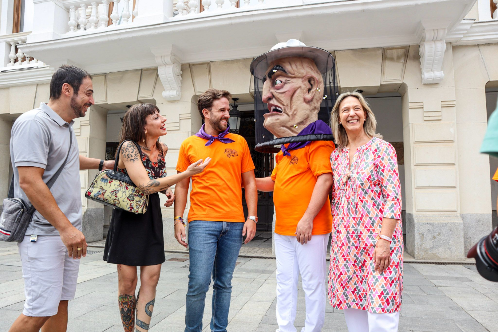 El nuevo cabezudo representa a un apicultor, con su característica careta cubierta de abejas y ataviado con la camiseta naranja de la Peña Escopitos, en un guiño simpático y festivo a la identidad de la peña donante. Su incorporación refuerza el carácter popular y cercano de la comparsa, que sigue creciendo gracias a la implicación de colectivos locales.