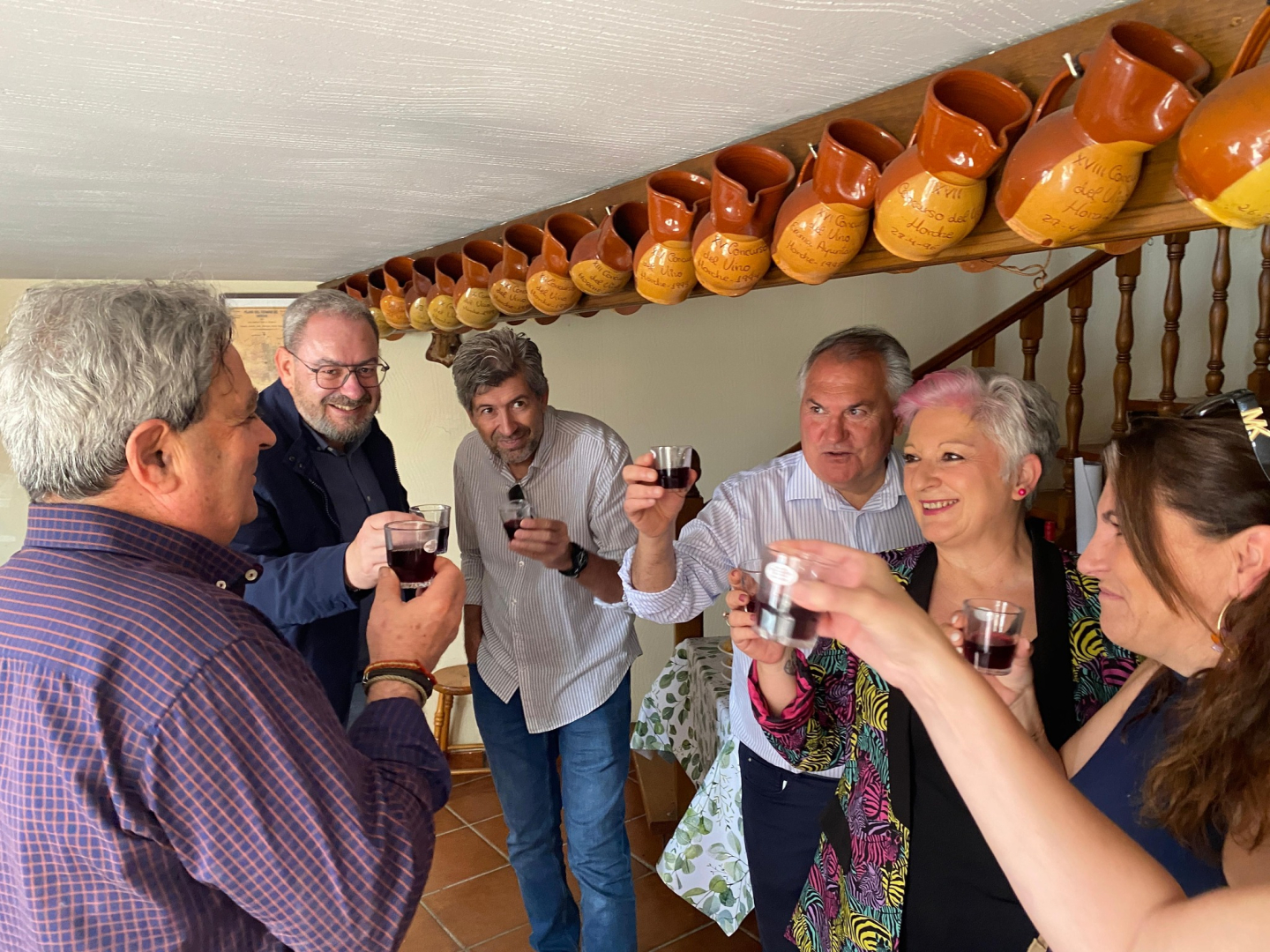La comitiva ha podido comprobar de primera mano cómo el relevo generacional en Horche está asegurado: jóvenes y veteranos comparten barra y secretos de fermentación en las bodegas.