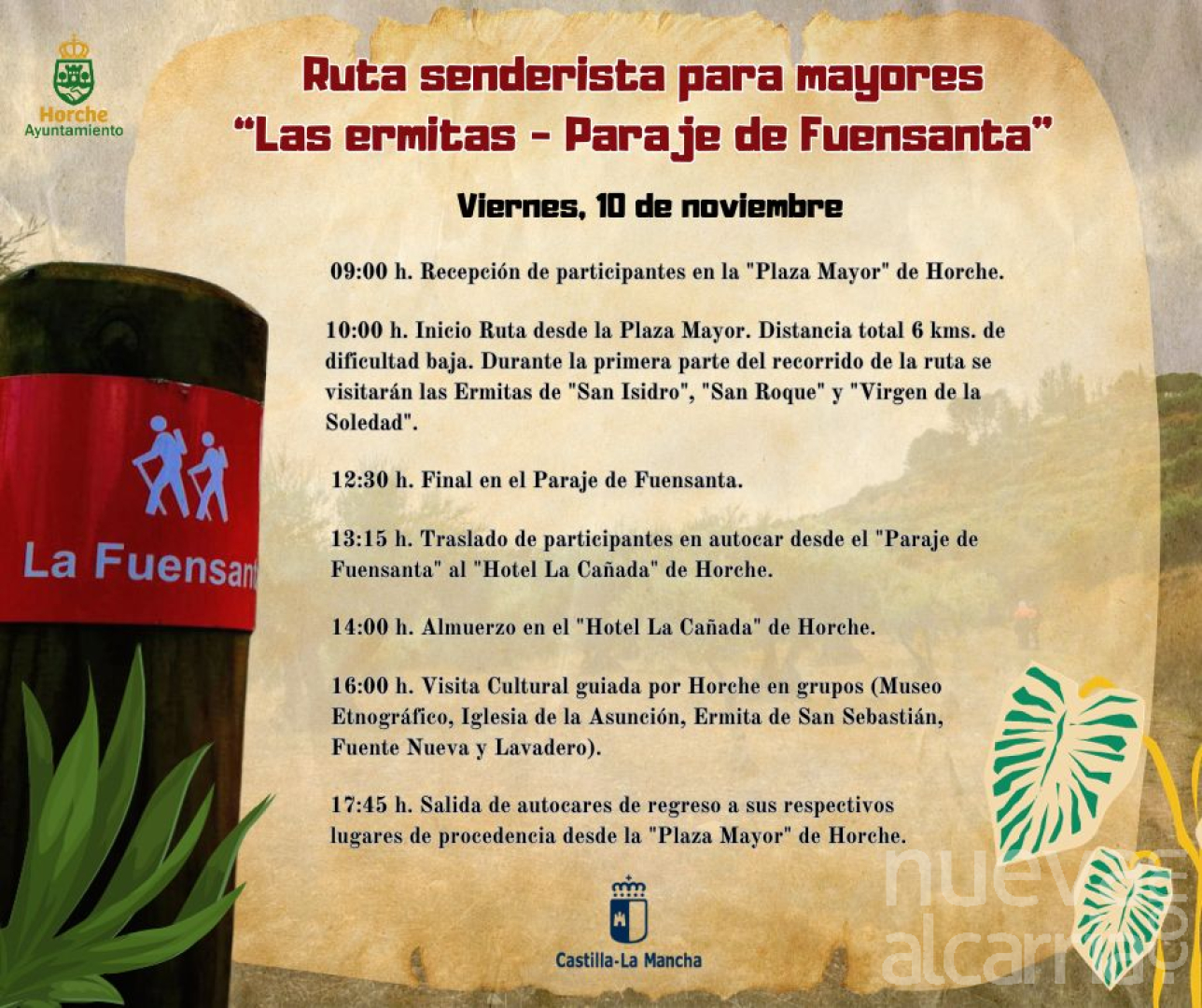 Con el objetivo de favorecer el rejuvenecimiento activo y mejorar la calidad de vida de las personas mayores, a través de la Consejería de Bienestar Social se ha desarrollado el programa 'Rutas Senderistas' que permitirá a un grupo de más de 220 mayores procedentes de toda la provincia realizar la 'Ruta de las Ermitas-Paraje de Fuensanta' en Horche este viernes, 10 de noviembre.