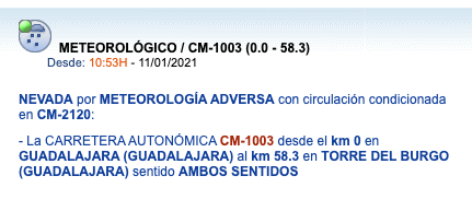 Actualización de las incidencias en las carreteras a las 9.00 horas del miércoles 13 de enero 08/01/2021 - 15:51 Oscar Gil Aviso especial. Ola de frío en Guadalajara 🔴 Obligatorio cadenas o neumáticos de invierno ⚫ Cortado a la circulación ‹ › X ×