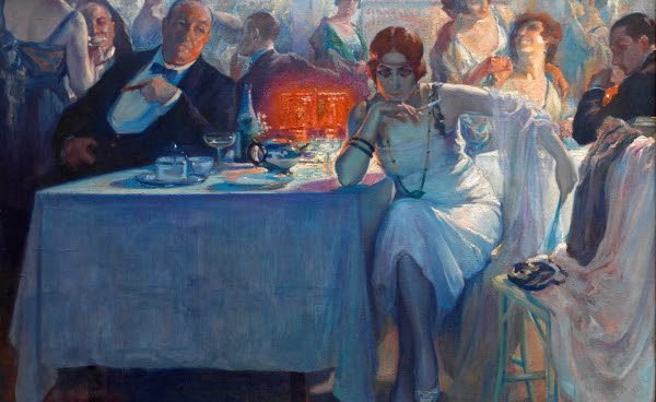 El término falena -mariposa nocturna de cuerpo delgado ydébiles alas, fatalmente atraída por el fuego- se asocia en la pintura de 1920 de Carlos Verger Fioretti a las mujeres que se ofrecían como acompañantes en los cenáculos elegantes. En la mesa del primer término un hombre maduro observa a una de ellas, que interpela a su vez al espectador con gesto inquietante.