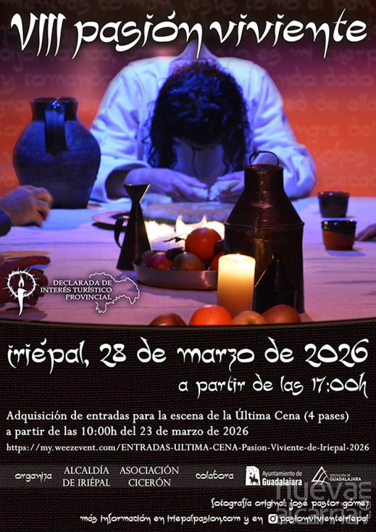 Este sábado, 28 de marzo, Iriépal celebra la VIII edición de su Pasión Viviente, una representación itinerante que comenzará a las 17.00 horas y que recorrerá distintos enclaves con escenas de la vida y pasión de Jesús. Este año, en su octava edición, la Pasión Viviente de Iriépal ostenta, por primera vez, su declaración como Fiesta de Interés Turístico Provincial, un reconocimiento a su consolidación y creciente proyección