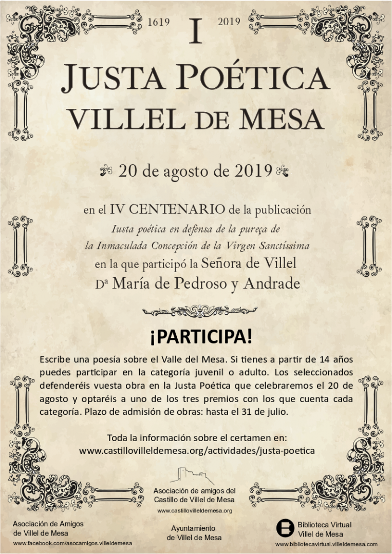 Con motivo del IV centenario de la publicación Iusta poética en defensa de la pureça de la Inmaculada Concepción de la Virgen Sanctíssima en la que participó la Señora de Villel Dª María de Pedroso y Andrade, la localidad organiza la I Justa Poética de Villel de Mesa.
