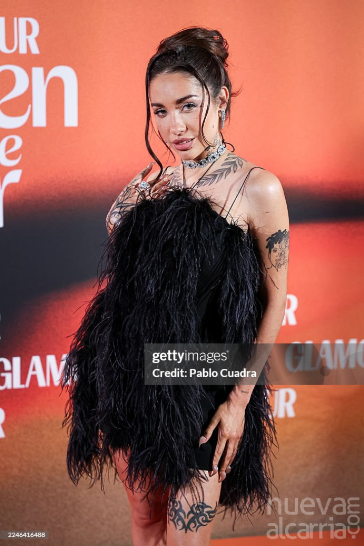 La artista lució un vestido mini de crepe con bolsillos ocultos y detalles de boas de plumas naturales, una pieza de la firma JCPAJARES que destaca por su carácter festivo y que, según la firma, se presenta como una de las propuestas clave para las próximas celebraciones de fin de año.