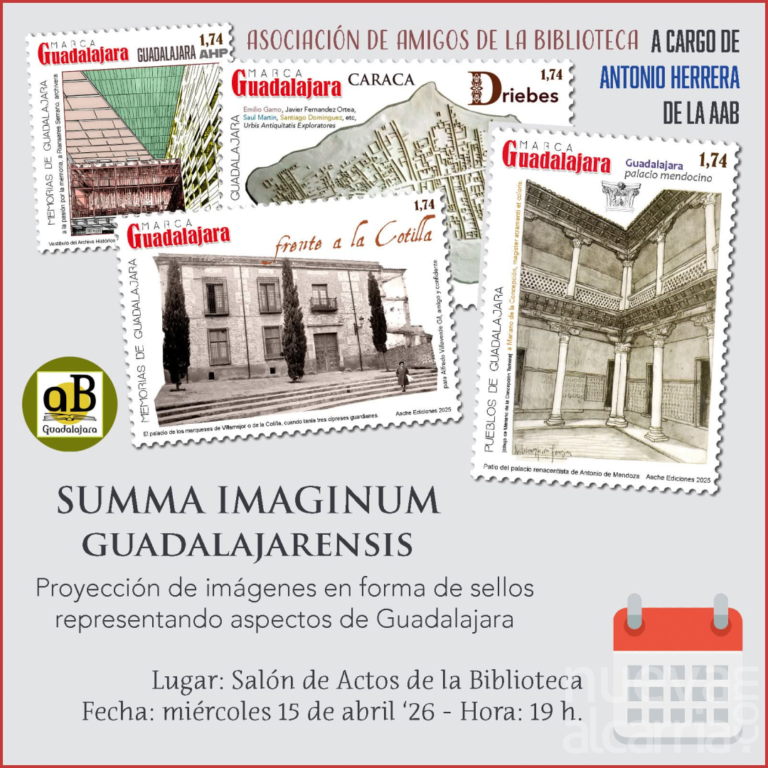La Biblioteca Pública de Guadalajara acogerá el próximo miércoles 15 de abril, a las 19.00 horas, la conferencia “Summa Imaginum Guadalajarensis”, una propuesta centrada en la proyección de imágenes en forma de sellos dedicadas a paisajes, monumentos y personajes de la provincia. El acto se celebrará en el salón de actos del centro, situado en la plaza de Dávalos, 1.