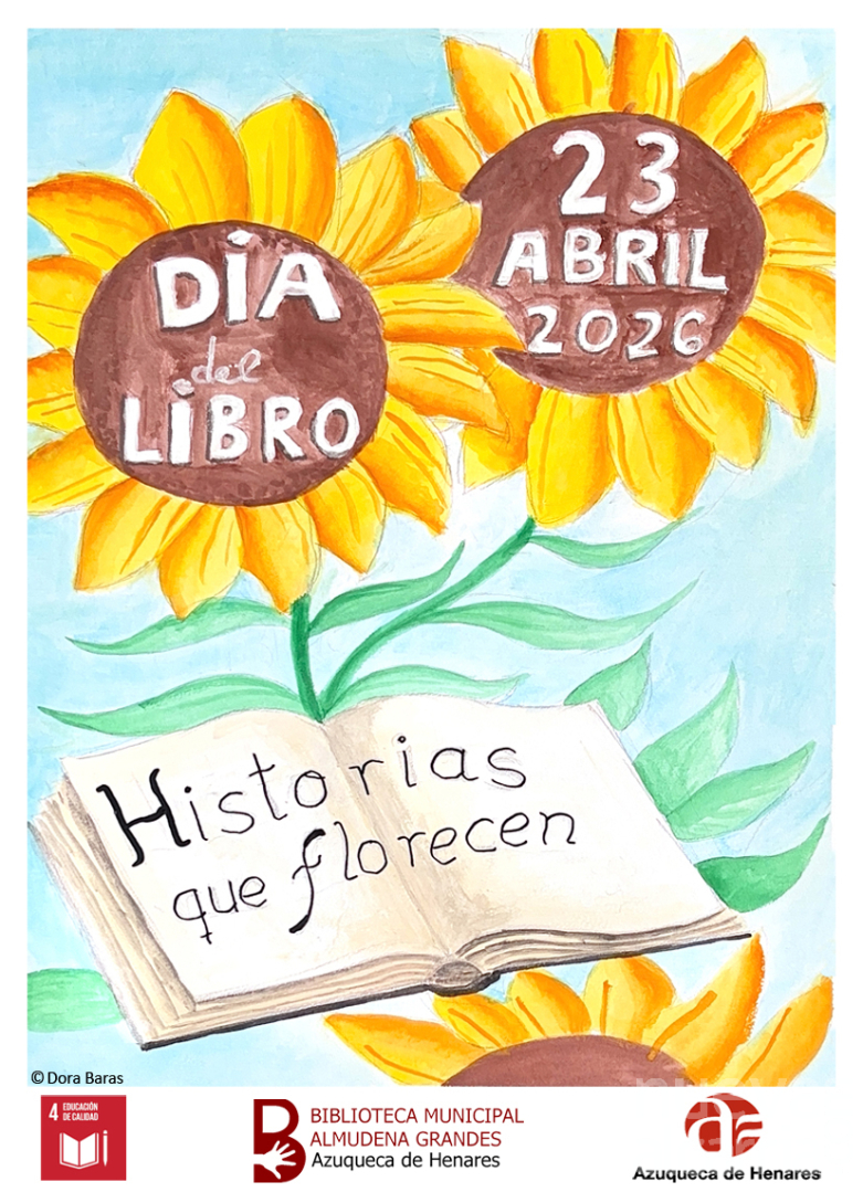 La Biblioteca municipal Almudena Grandes ha preparado un programa especial de actividades con motivo del Día del libro, que se conmemora este jueves, 23 de abril. Hasta el día 30 de abril, se podrá ver en la Casa de la Cultura la exposición con los trabajos presentados por el alumnado de los IES de Azuqueca al V Concurso para el cartel del Día del libro “Historias que florecen”. El premio al trabajo ganador, de Dora Baras, alumna del colegio Giovanni Antonio Farina, se entregará el mismo 23 de abril, en la Biblioteca. Durante toda la semana, las personas que utilicen el servicio de préstamo de la Biblioteca recibirán un marcapáginas y, además, se han previsto actividades en las salas de adultos e infantil que incluirán un sorteo de lotes de libros.