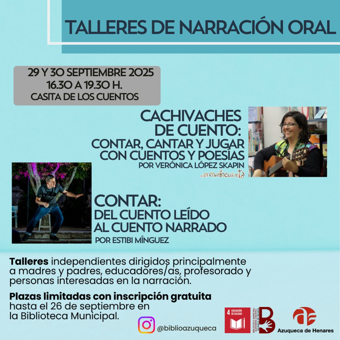 Los talleres se van a impartir en la Casita de los Cuentos Eva Ortiz por las tardes, en concreto, de 16:30 a 19:30 horas. El lunes 29 de septiembre, Verónica López Skapin (Encantacuento) presentará “Cachivaches de cuento: contar, cantar y jugar con cuentos y poesías”, mientras que el martes 30 será el turno de Estibi Mínguez con “Contar: del cuento leído al cuento narrado”.