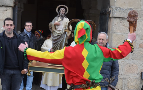 Tras la misa, llegó el momento más esperado: la Botarga, encarnada este año por Marcos Domingo, bailó ante la talla de San Pablo a la salida de la parroquia. La intensa helada obligó a acortar el recorrido de la procesión, pero no disminuyó la emoción del público. Desde el templo, los asistentes se dirigieron a la Plaza Mayor, donde les esperaba la Botarga de Humanes, invitada para la ocasión. Allí, el grupo de baile “Almirez” continuó animando la fiesta al son de los dulzaineros seguntinos.