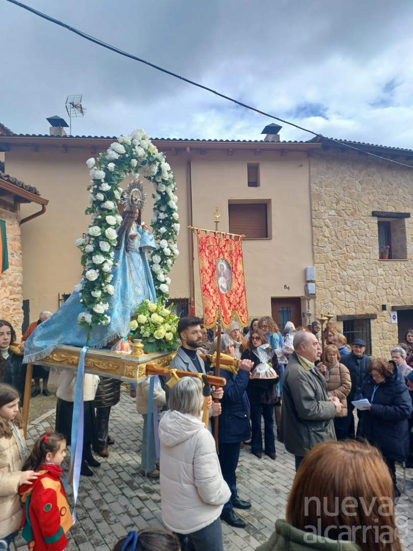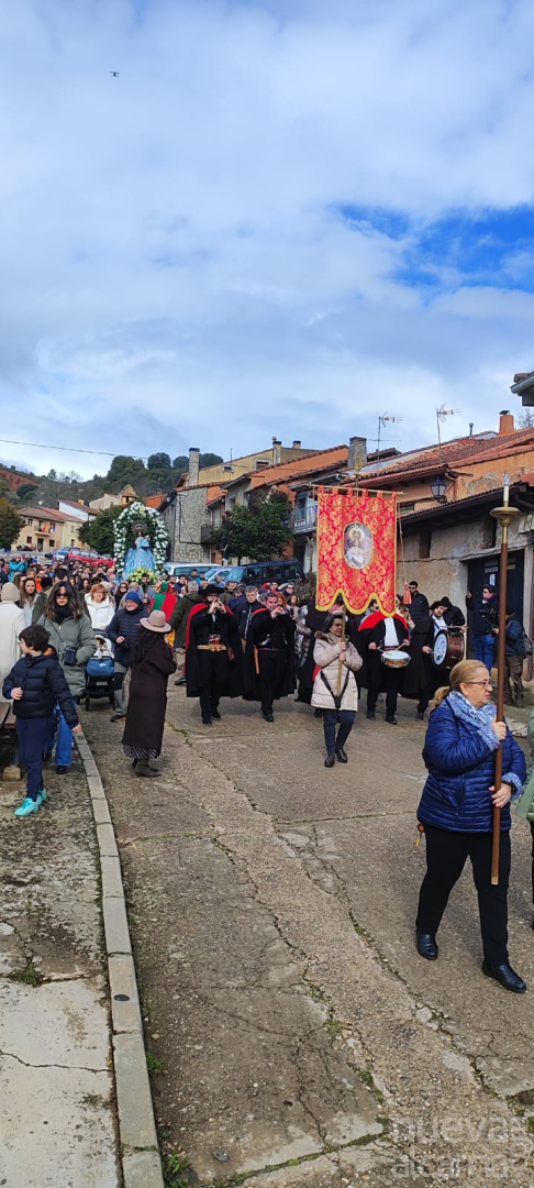 El vecindario queda listo y al marcar el reloj el mediodía la esplendorosa Virgen de las Candelas cruza el umbral del templo. Y bajo el pórtico se subastan los banzos, para arrancar una multitudinaria procesión. El equipo de gobierno, encabezado por Juan Antonio Martín, preside los actos. También asisten el senador Lucas Castillo, el diputado regional Nacho Redondo y la diputada provincial Elena Sebastián. Con los primeros sones procesionales interpretados por los dulzaineros, arranca la solemne procesión. Una marcha que recorre la población desde su parte más alta hasta las primeras casas del núcleo, cubriendo la totalidad de la longitud de la calle Mayor.