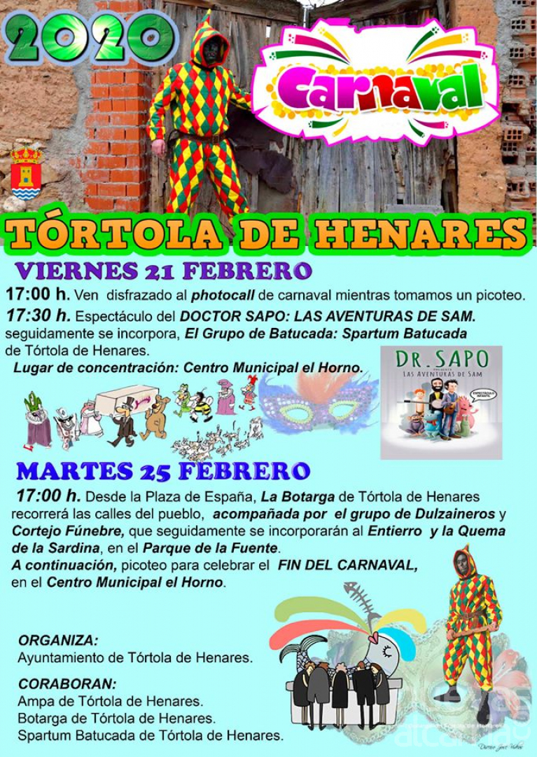 Arranca la celebración del Carnaval este mismo viernes con una merienda en el Centro Municipal El Horno. A las 17.00 horas, todos los disfrazados podrán hacer fotos y acudir al espectáculo del Dr. Sapo. Las aventuras de SA; mientras el grupo de batucada Spartum Batucada de la localidad esperará su turno para amenizar la fiesta.