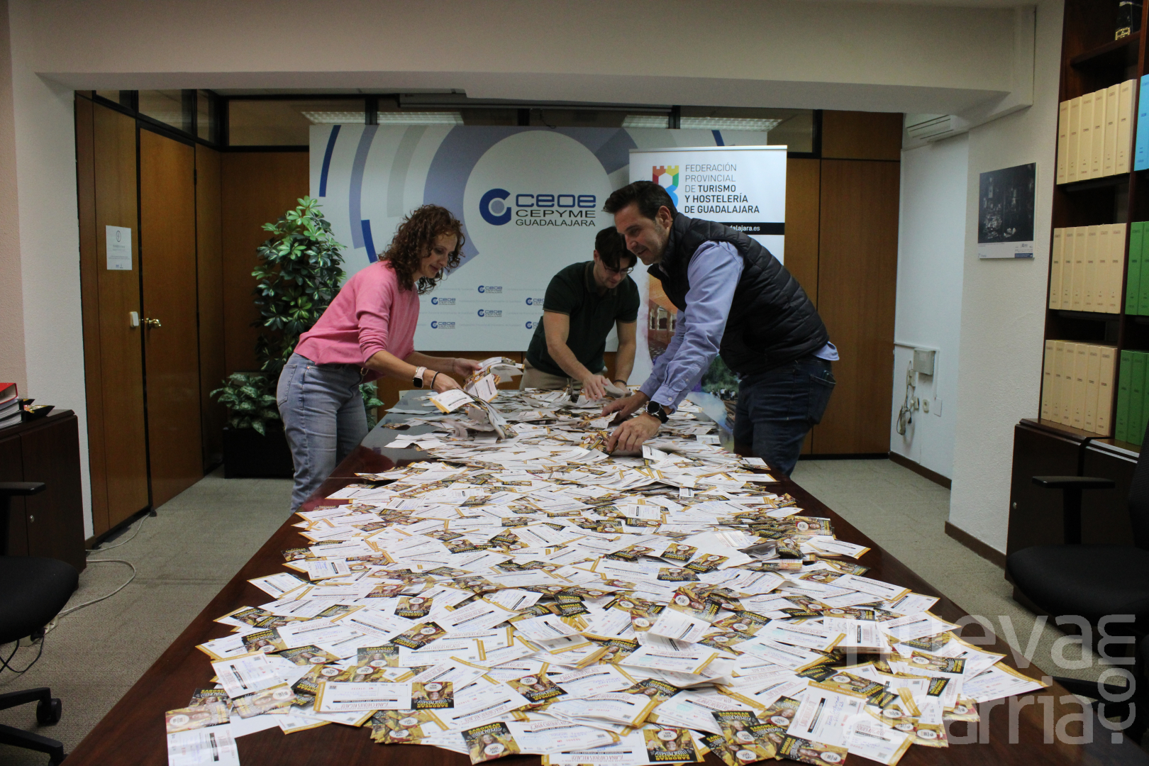 Técnicos de Turismo del Ayuntamiento de Guadalajara, y Juan Carlos Molina, secretario técnico de la Federación Provincial de Turismo y Hostelería de Guadalajara, integrada en CEOE-CEPYME Guadalajara, han sido los encargados de extraer las 100 papeletas ganadoras del último sorteo de la campaña “Saborear Guadalajara, tiene premio”. Cada premiado recibirá un cheque de 60 euros para disfrutar en cualquiera de los cerca de cien establecimientos adheridos a la campaña y distribuidos por toda la ciudad.