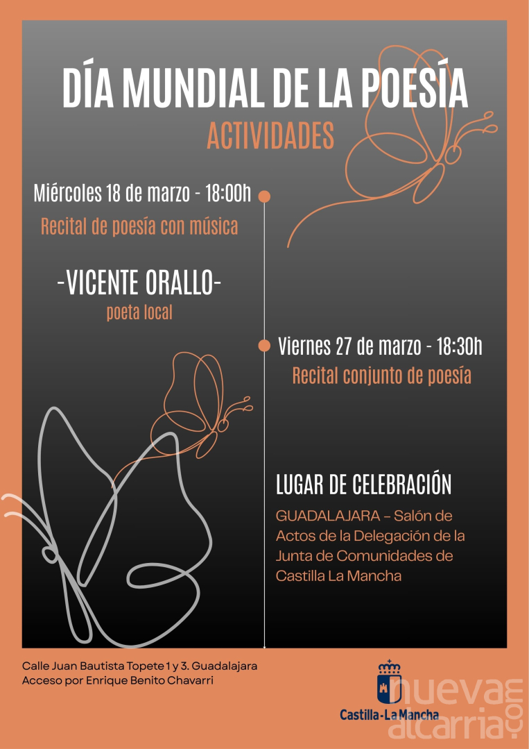 La Delegación de Educación, Cultura y Deportes de la Junta de Comunidades de Castilla-La Mancha ha organizado en Guadalajara dos actos con motivo del Día Mundial de la Poesía, que se celebra esta semana, ambos en el Salón de Actos de la Delegación.