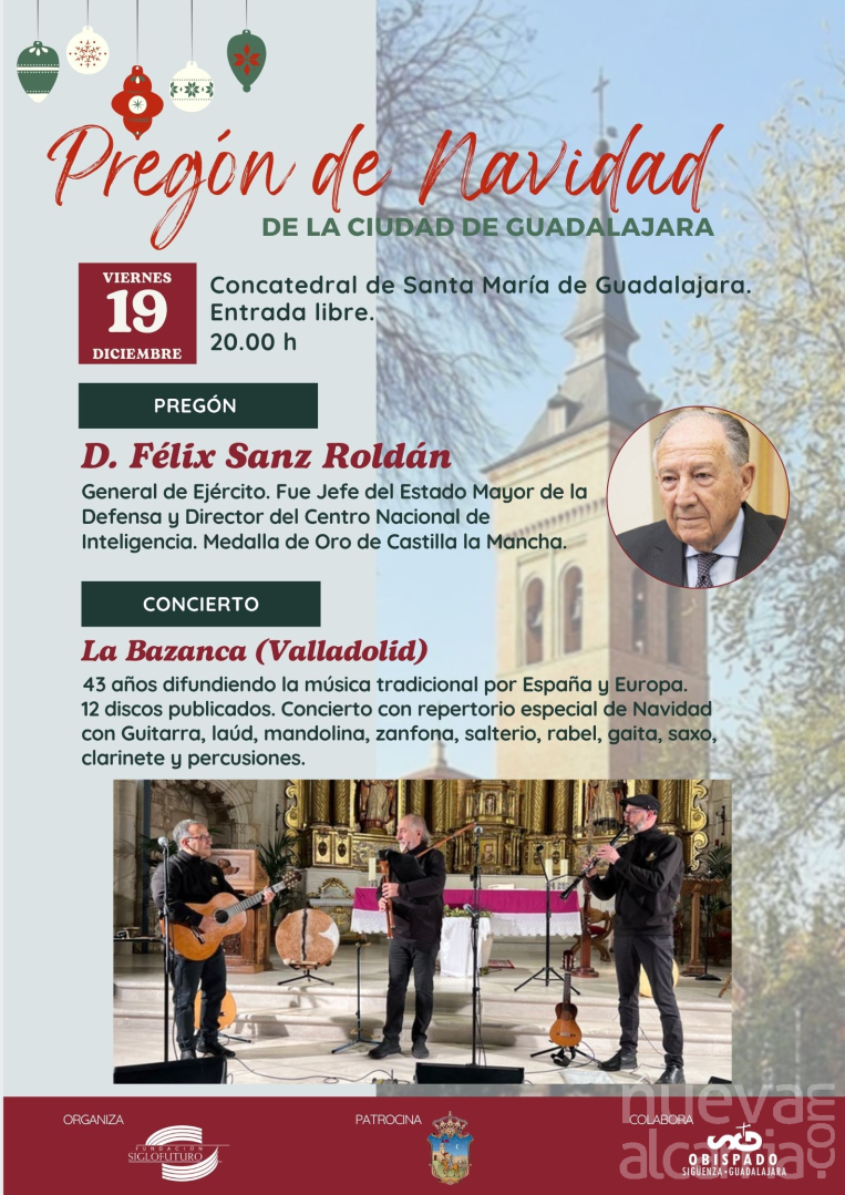 El viernes 19 de diciembre, a las 20:00 horas, la concatedral de Santa María acogerá el Pregón de Navidad, que correrá a cargo de Félix Sanz Roldán, general de Ejército, exjefe del Estado Mayor de la Defensa y exdirector del Centro Nacional de Inteligencia, distinguido también con la Medalla de Oro de Castilla-La Mancha. Tras el pregón, tendrá lugar un concierto de música tradicional navideña ofrecido por el Trío La Bazanca, grupo vallisoletano con más de 45 años de trayectoria, 19 discos grabados y actuaciones en auditorios de España y del extranjero. La entrada será libre, con la colaboración del Obispado de la Diócesis de Sigüenza-Guadalajara.